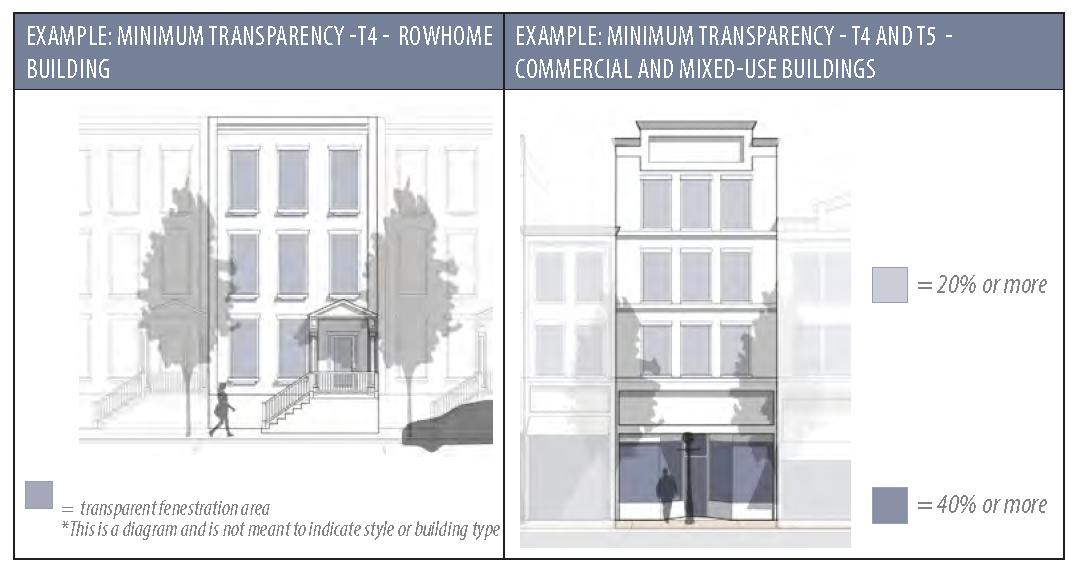 Transparency, Specific to RMX and IC Districts: Building elevations that face the street shall have at least 40% of the first-floor wall area consist of windows and/or doors, and 15% of upper floors.