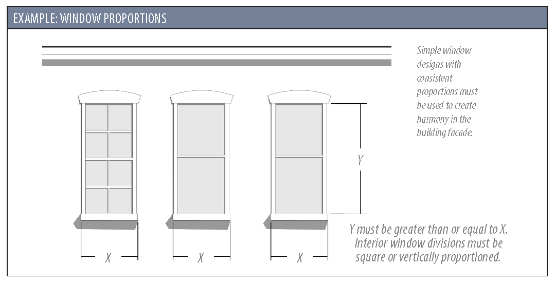 Facades should have several window sizes with smaller ones above. This is particularly important when buildings rise more than 2 stories.