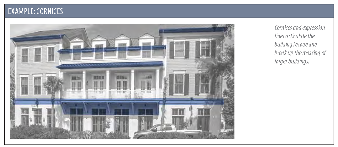 Cornices are recommended to delineate the tops of facades. Expression lines are recommended to delineate the divisions between the first floor and upper floors.