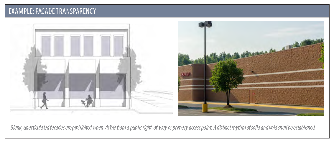 Shall not include expanses of blank walls (without any transparent windows or doors) of 20 linear feet or greater.