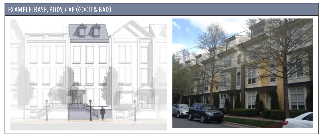 All buildings shall have a clearly discernible base, body, and cap, with masonry soldier courses or other horizontal expression lines separating each element.
