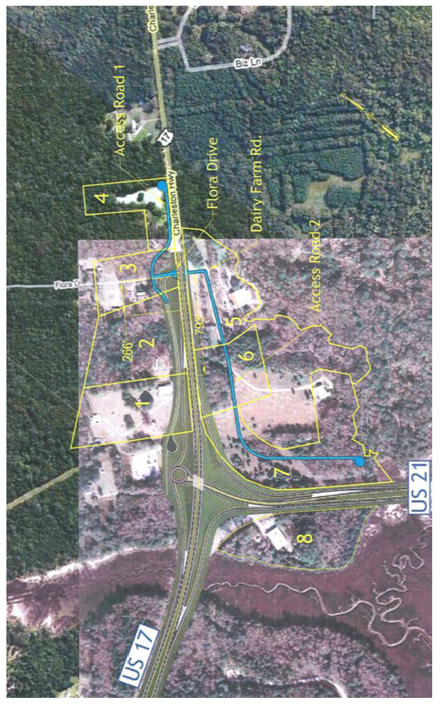 New development on properties in the district that are south of U.S. 17 and east of U.S. 21 is contingent upon extension of access via Dairy Farm Road. This access should provide a right-in/right-out curb cut onto U.S. 21.
