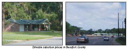 Drivable suburban places were developed primarily after the 1960's on the edges of the historic settlements of Beaufort County, many through the Planned Unit Development (PUD) process. In these types of places, the design and layout of development is driven first and foremost to accommodate the automobile. In addition, land uses are segregated and buffered from one another, leaving large distances between them. People who live in drivable suburban places must rely on automobiles to function on a day-to-day basis.