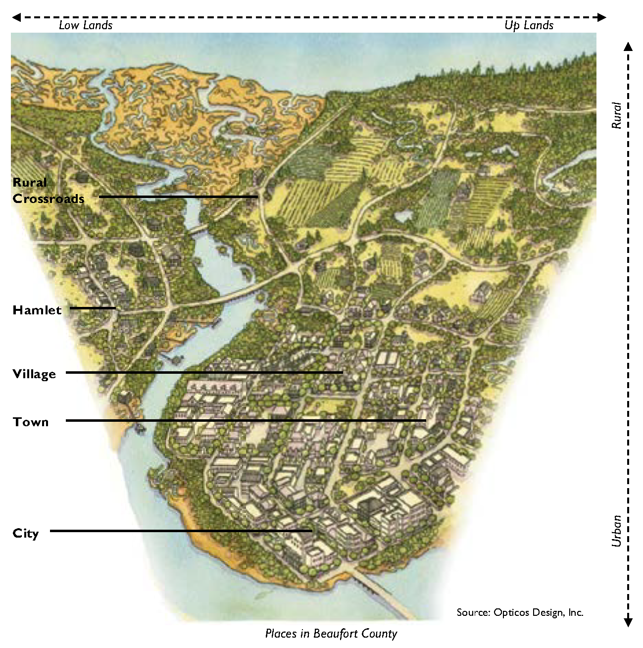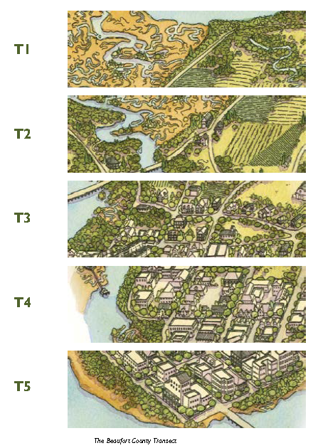 The Beaufort County Transect has been defined to respond to the forms of places within the County, and covers the full range of the Rural-to-Urban Transect as follows: