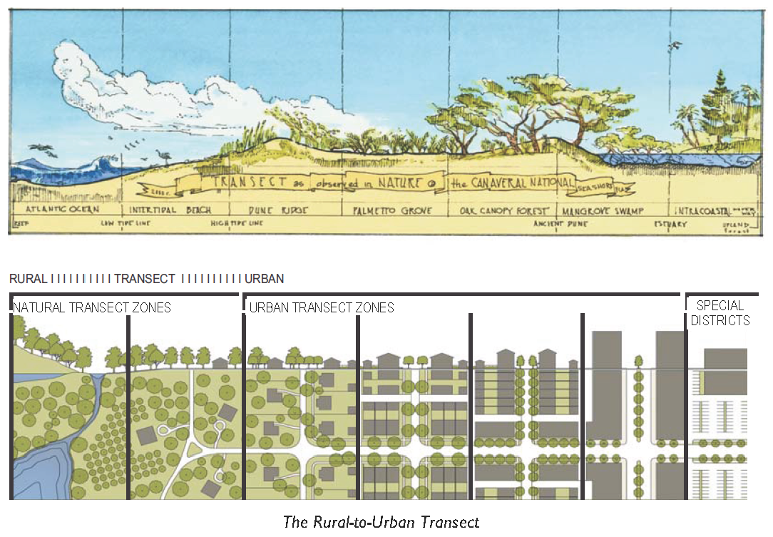 The Rural-to-Urban Transect has its foundation in nature as it is found in the lowcountry, as has been illustrated in James Wassell's depiction of the transect as observed in nature at the Canaveral National Seashore (see image below).