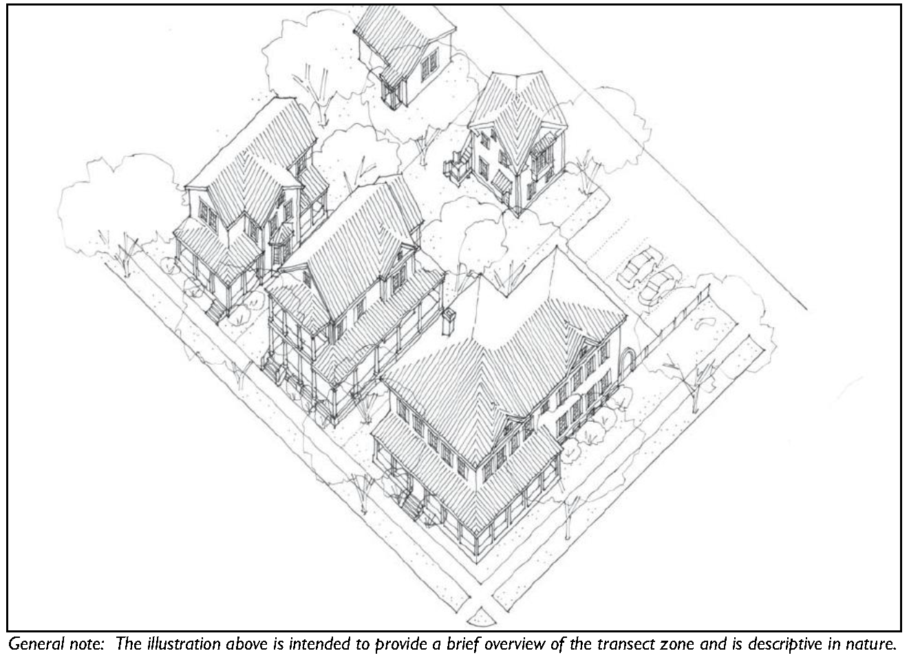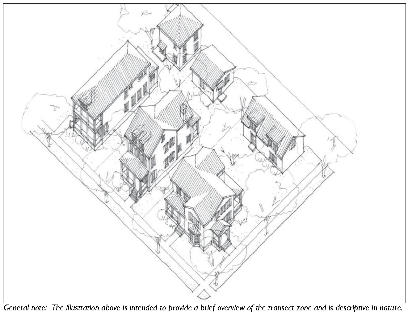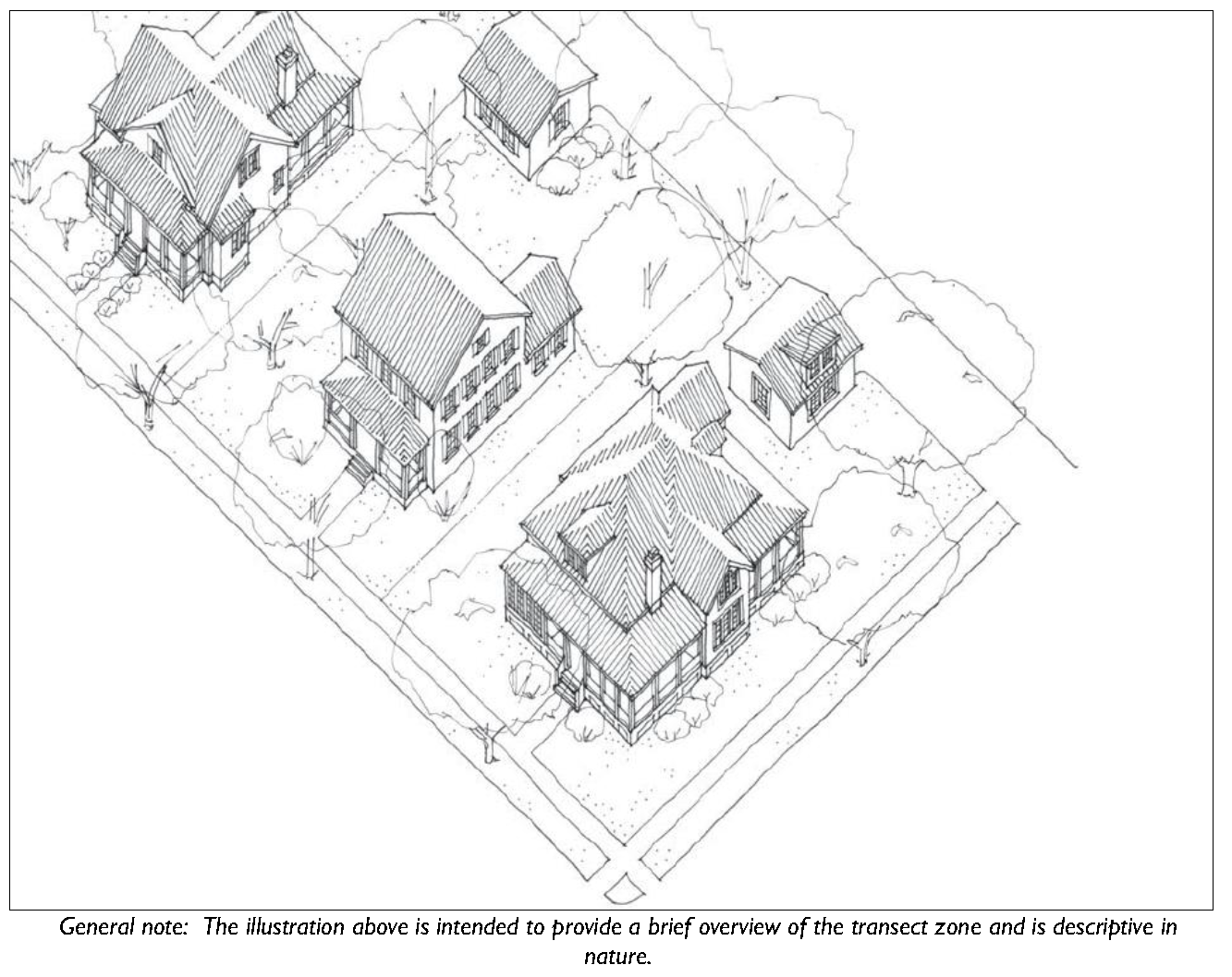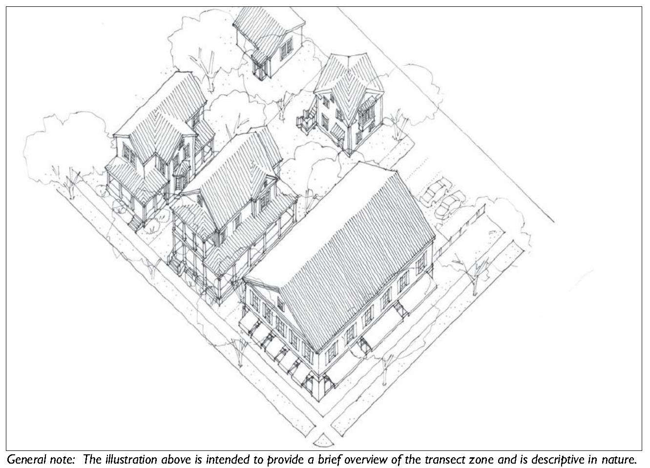 The transect zones are described in Division 3.2 (Transect Zones). They primarily focus on mixed-use, walkable areas of the County and range in function and density from primarily residential areas with a mix of building types (e.g. T3 Hamlet Neighborhood), to medium density neighborhoods and other commercial and retail areas (e.g. T4-Hamlet Center).