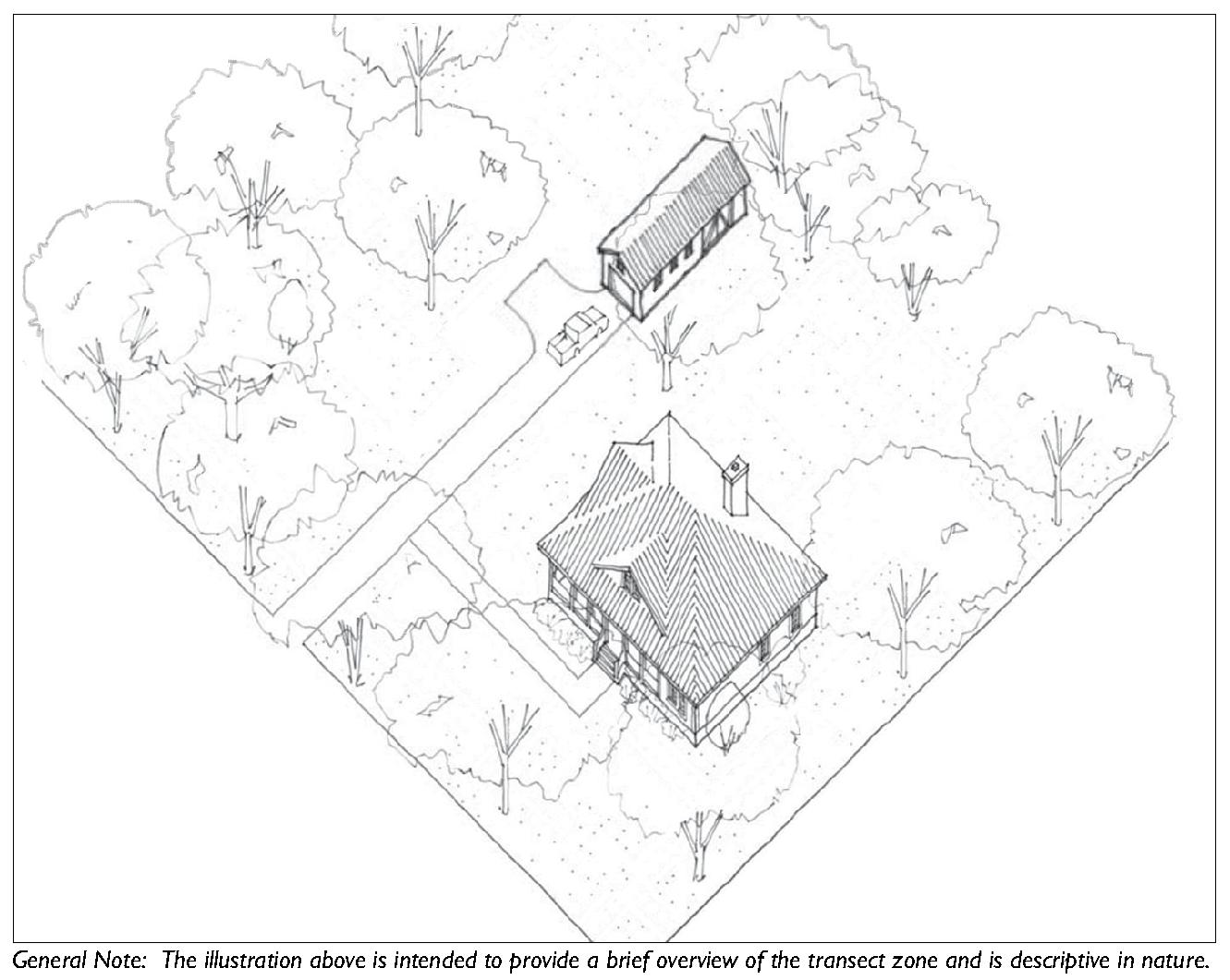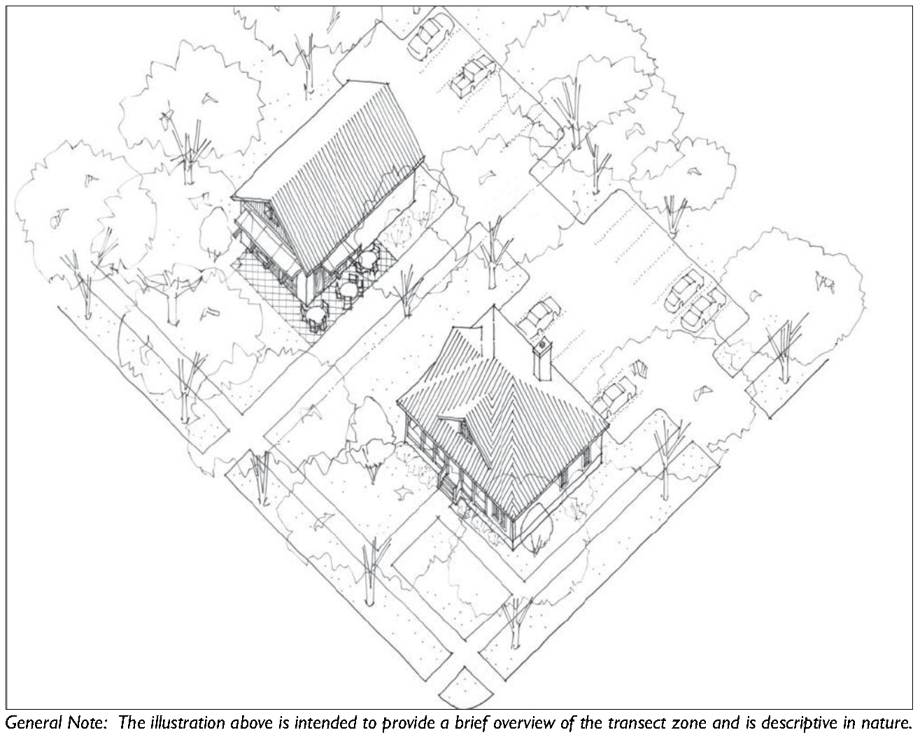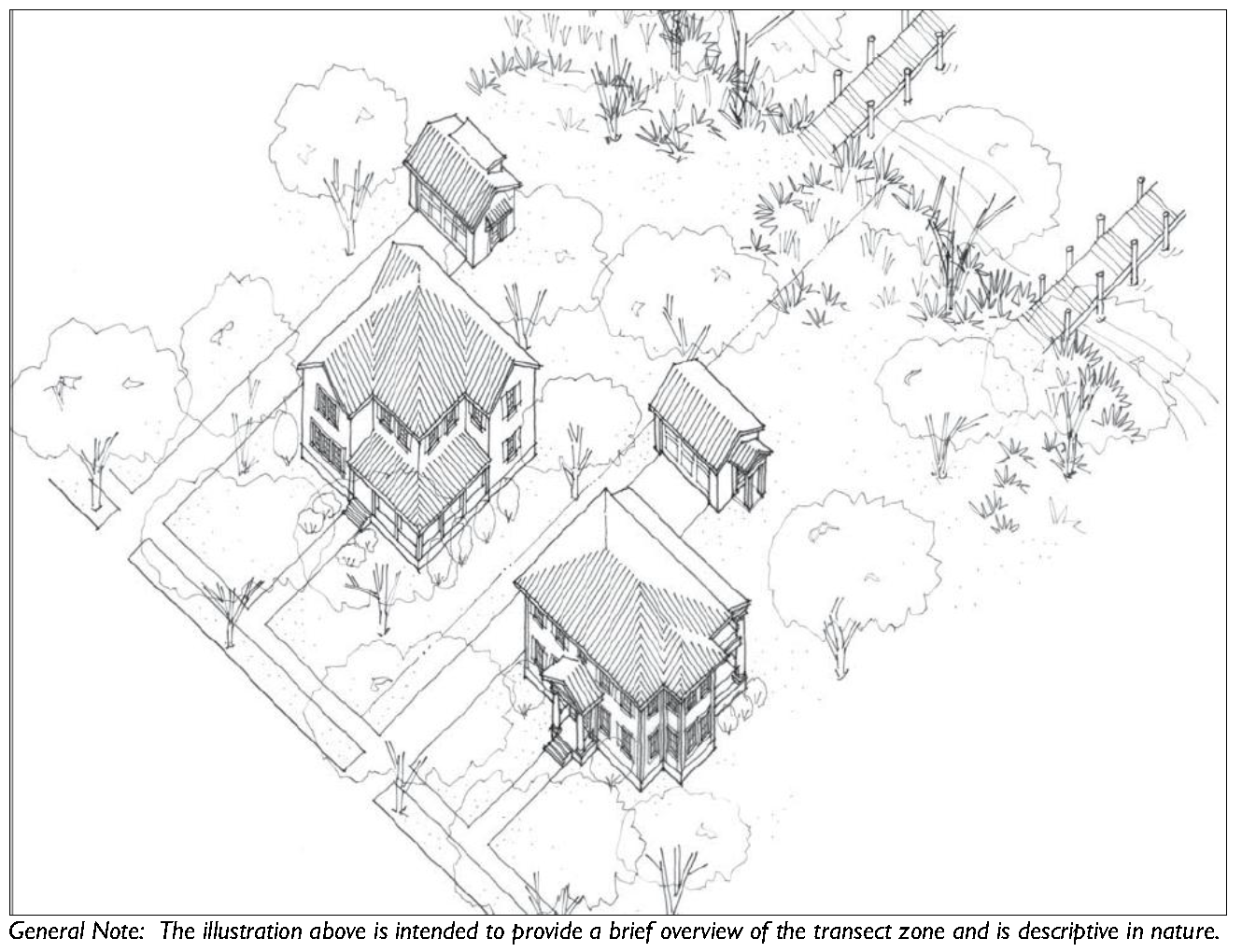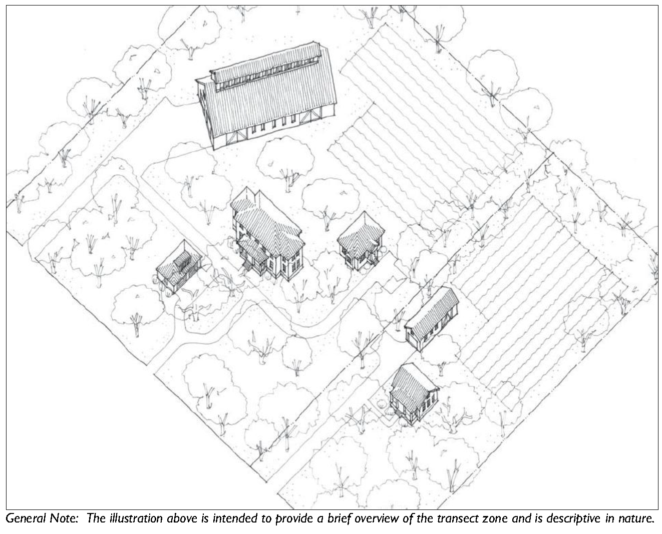 The transect zones are described in Division 3.2 (Transect Zones). They primarily focus on mixed-use, walkable areas of the County and range in function and density from primarily residential areas with a mix of building types (e.g. T3 Hamlet Neighborhood), to medium density neighborhoods and other commercial and retail areas (e.g. T4-Hamlet Center).