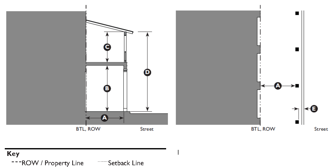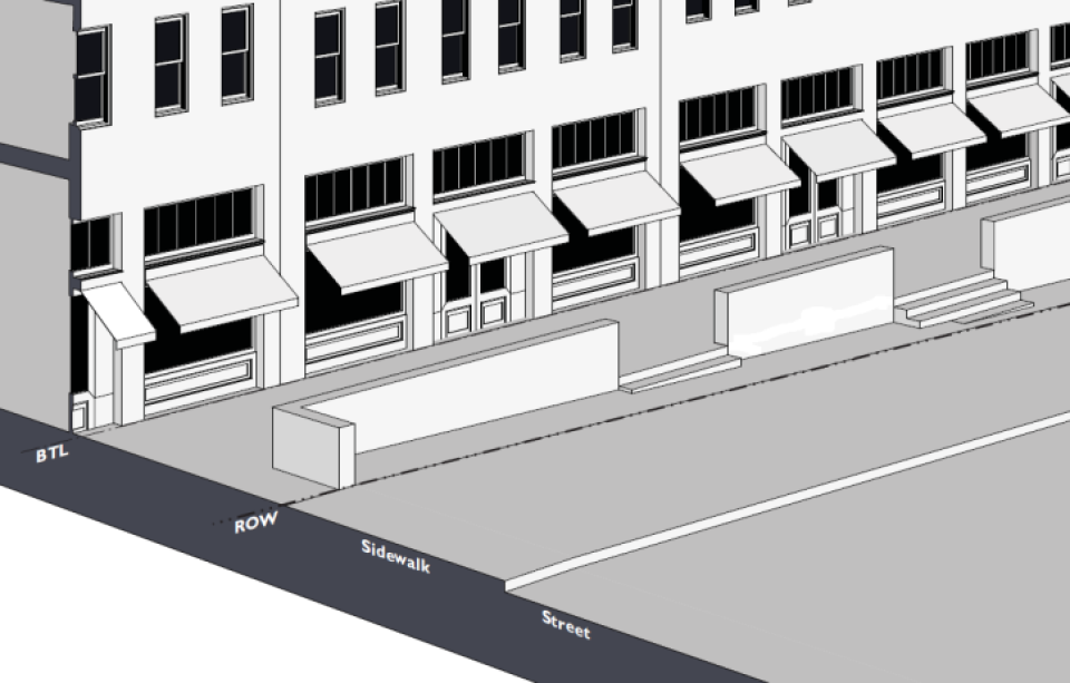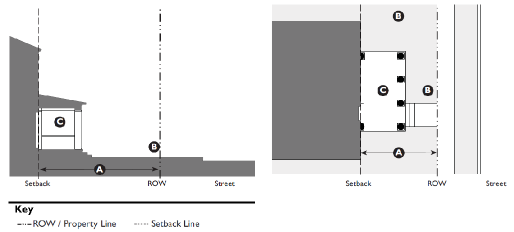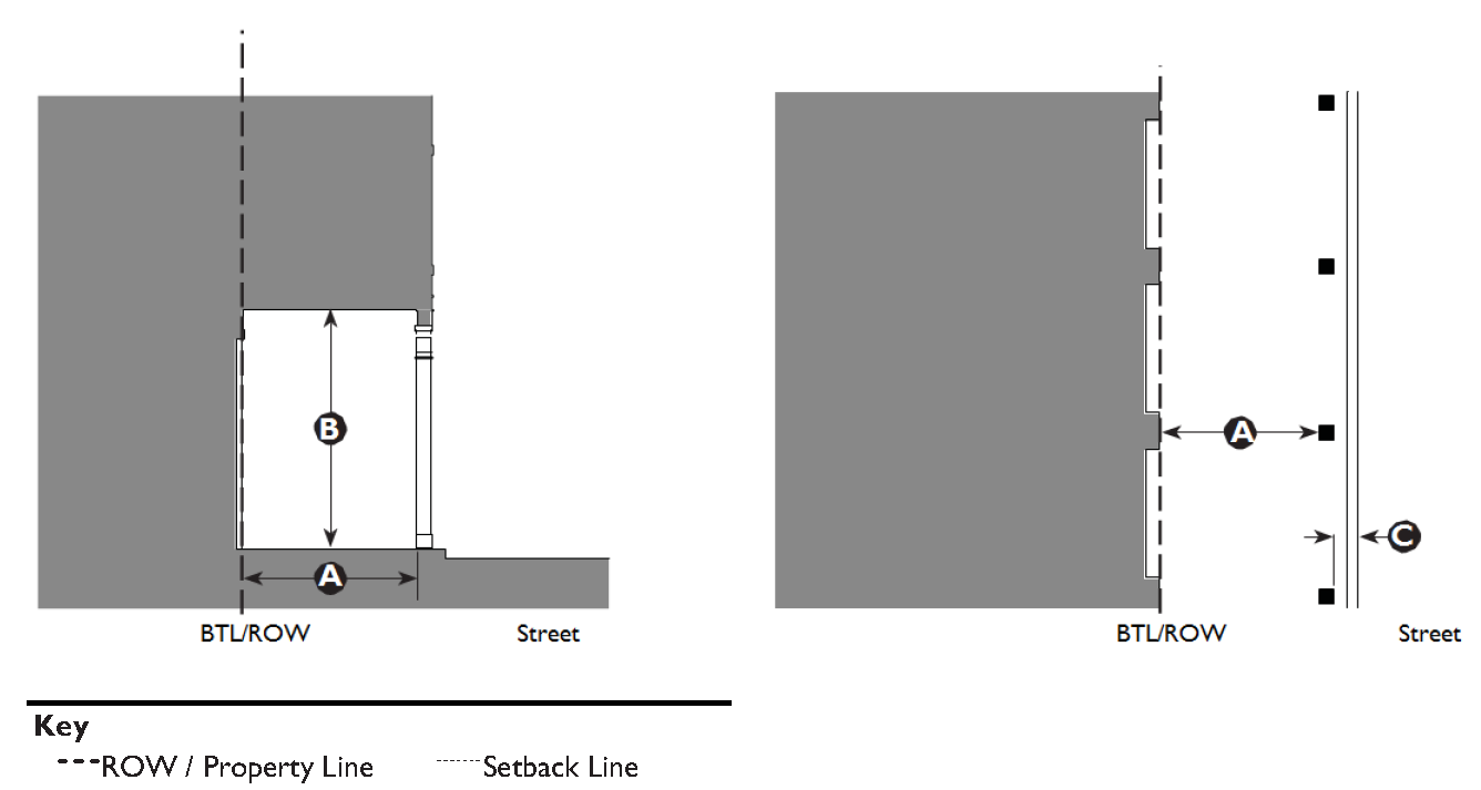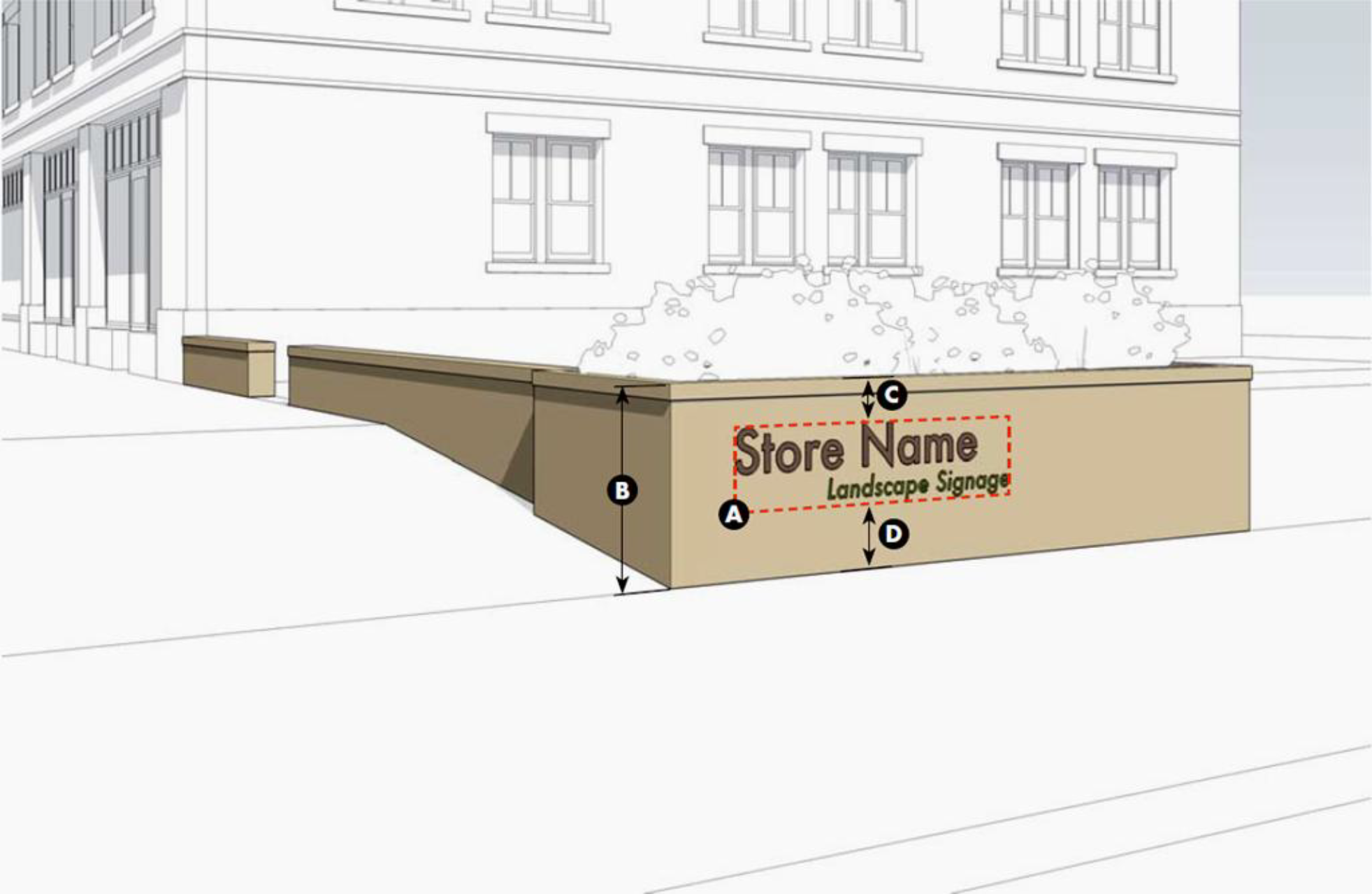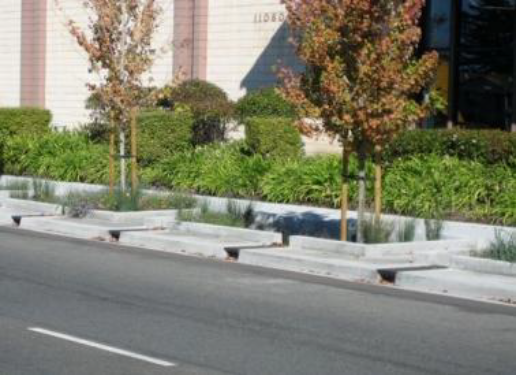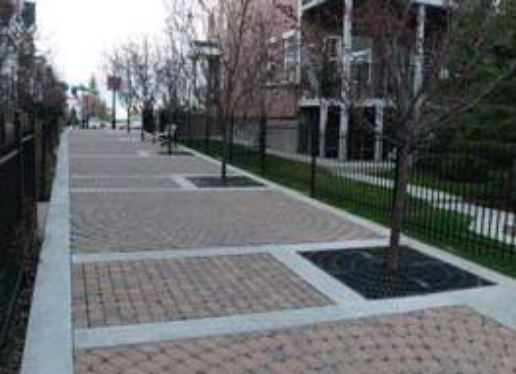 Street Trees planted in a tree well or continuous planter, which may be sited a minimum distance of three feet from walkways, curbing, and other impervious pavements.