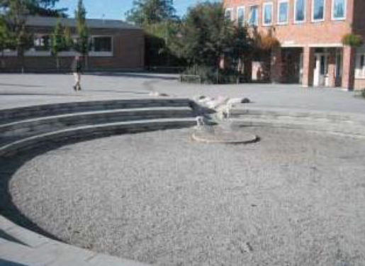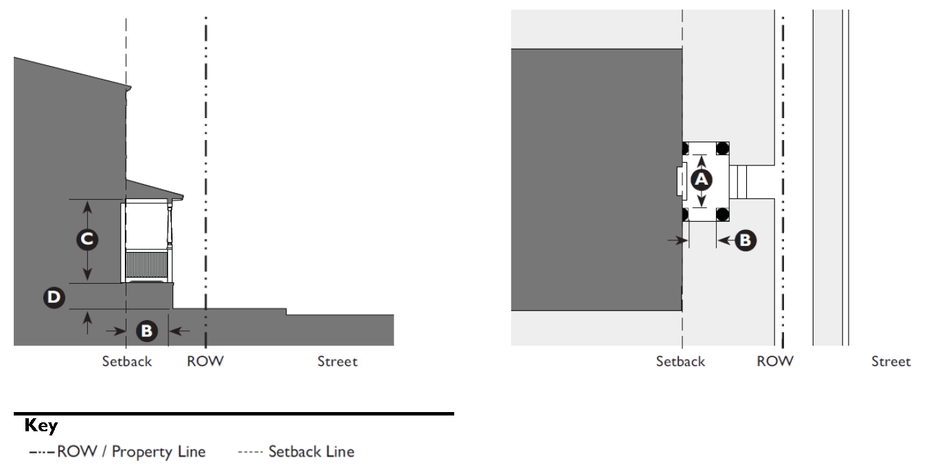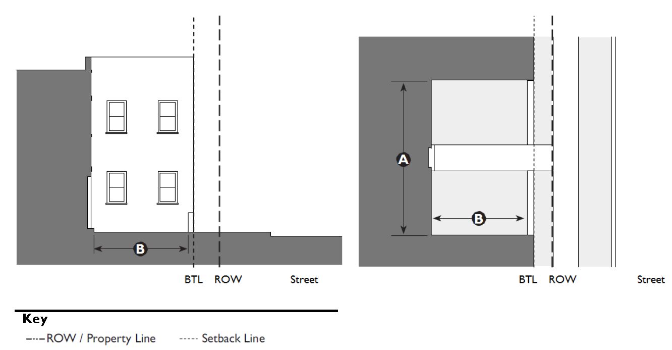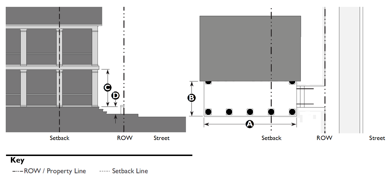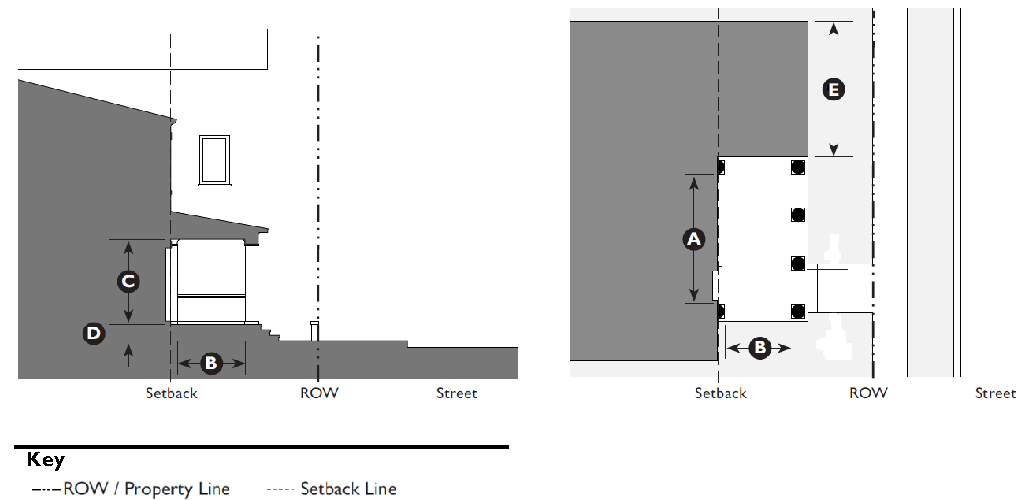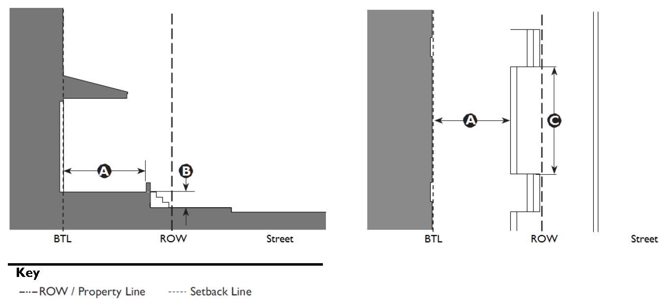 Street Trees planted in a tree well or continuous planter, which may be sited a minimum distance of three feet from walkways, curbing, and other impervious pavements.