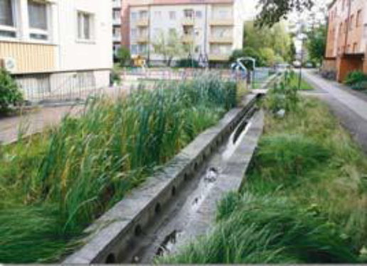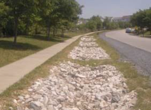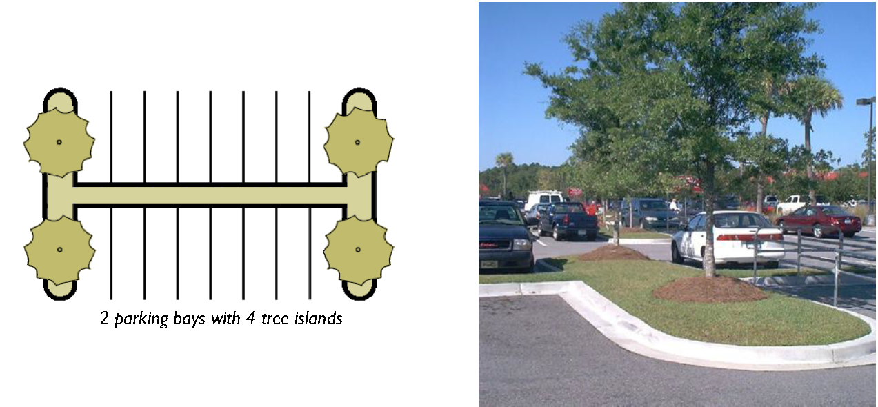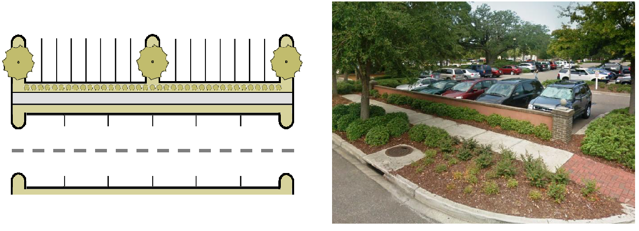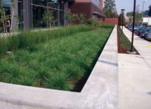 Street trees planted in a continuous swale, which may be sited a minimum distance of four feet from walkways, curbing, and other impervious pavements.