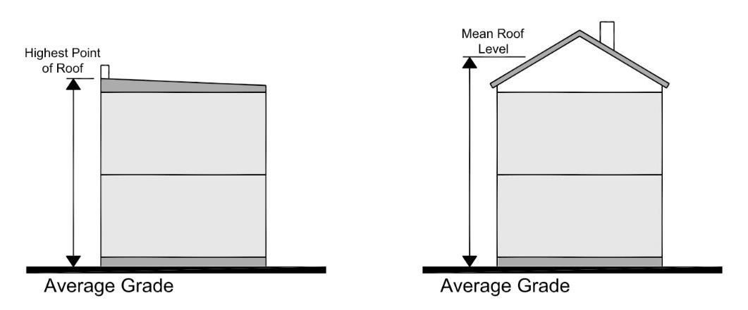 • Building, height of. The vertical distance from the grade to the top of the roof surface of a flat roof, to the mean level of the highest gable or slope of a hip roof. When a building faces on more than one street, the height shall be measured from the average of the grades at the center of each street front.