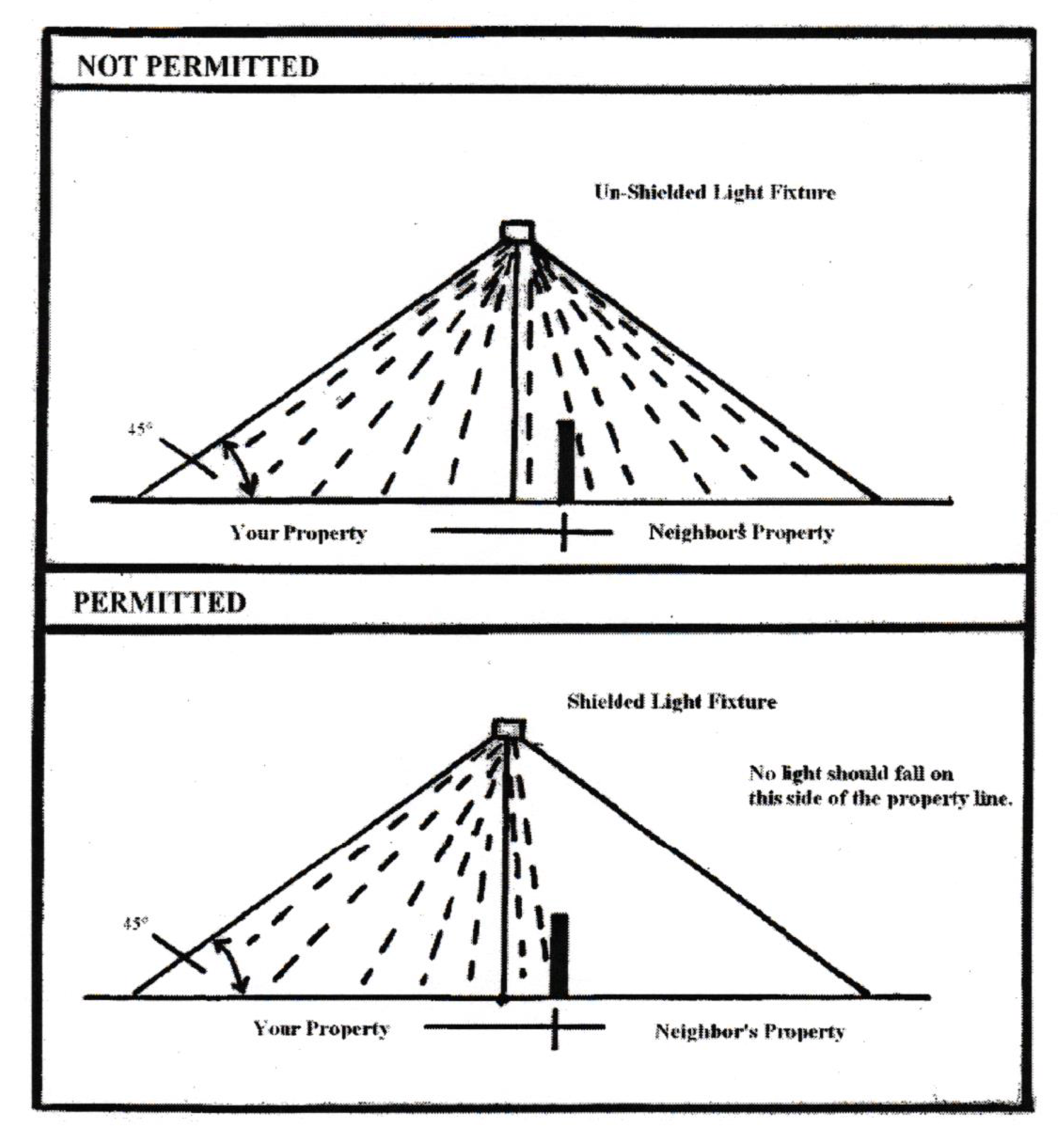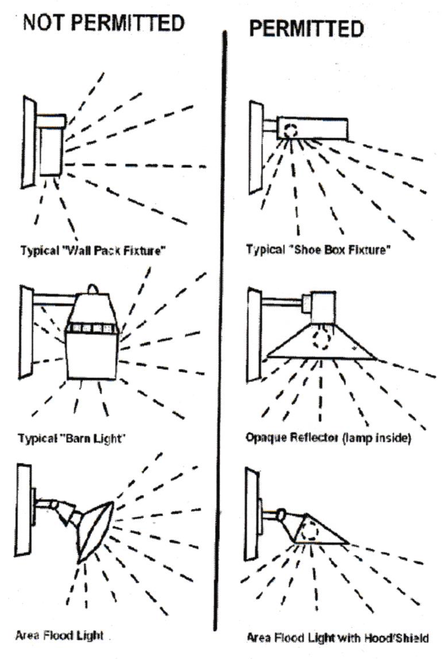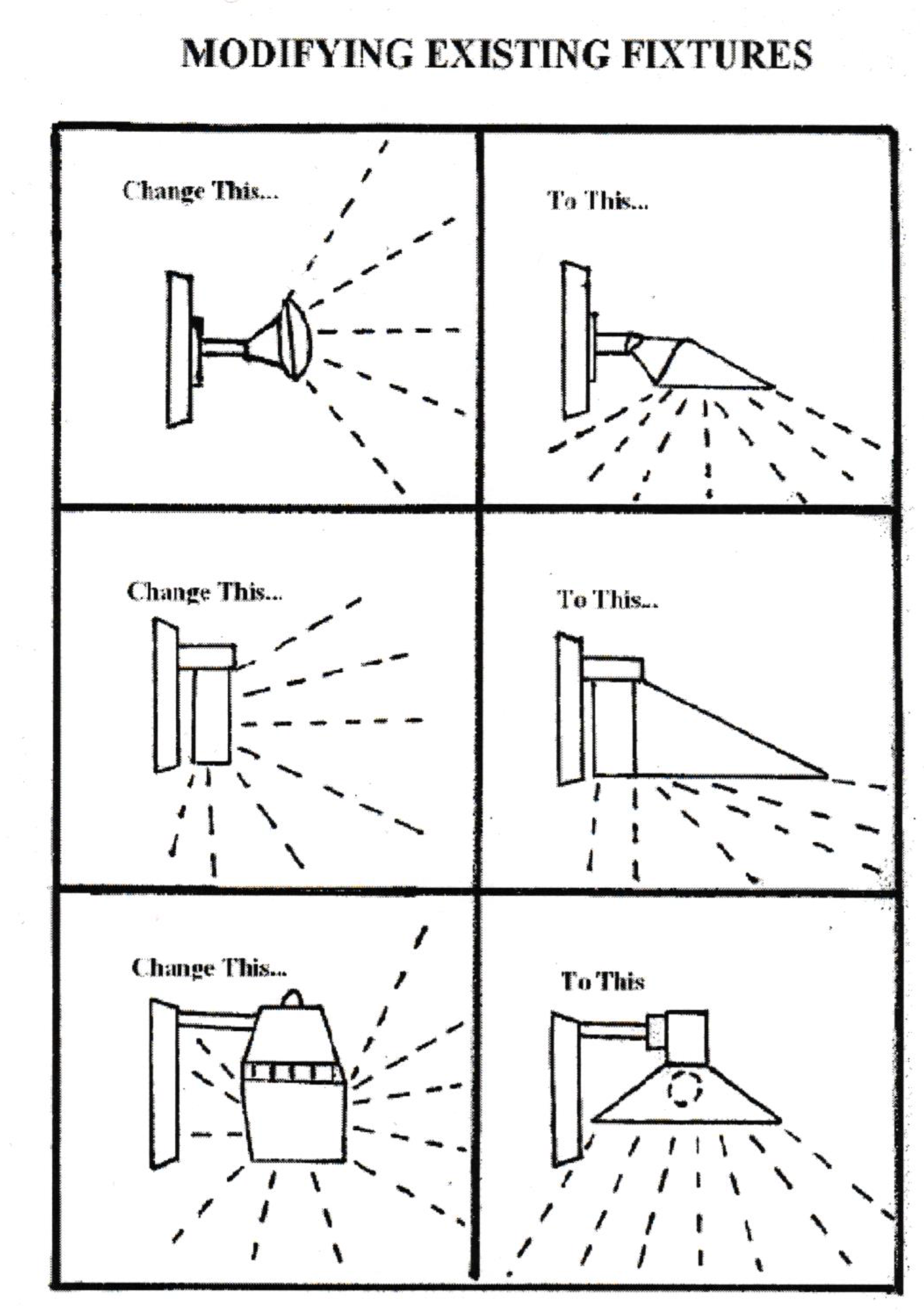 Existing fixtures may be modified to comply with this article by adding a properly designed hood or shield or by pointing any upward-mounted, shielded fixtured downward onto the ground surface. Examples of acceptable modification for existing fixtures can be seen within the provision herein.