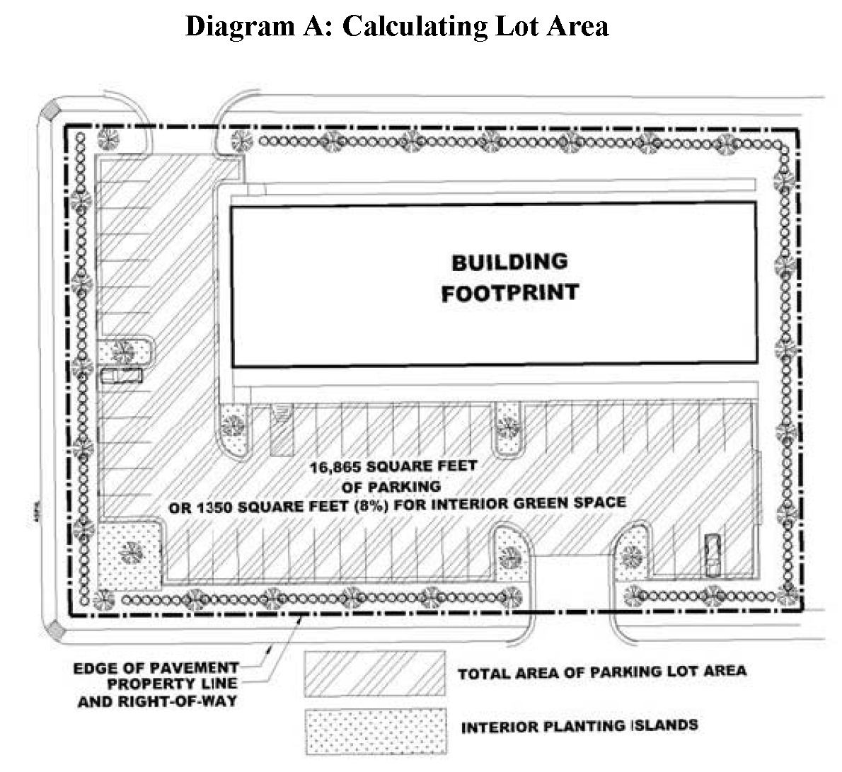 Calculating lot area. Diagram A, illustrates what areas of the lot are considered when determining the total area of the parking lot. The total amount of landscape area for the interior lot is determined by figuring five percent, eight percent, or ten percent of the total parking lot area as explained in subsections (c)(2)a. and (c)(2)b. of this section: