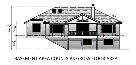 "Gross floor area" The sum of square feet (area) of all floors to equal the total square footage of any dwelling as measured to the outside wall, including attached garage (whether conditioned or not), roofed porches and balconies (screened, enclosed, or open), porte cocheres, and other similar areas. A maximum 25% of the floor space of any basement that has an exterior door and/or pedestrian access/height at or above finish grade counts as gross floor area (image below). A basement that does not have an exterior door and/or pedestrian access/height at or above finished grade does not count as gross floor area. Gross floor area does not include an attic as defined in this section.