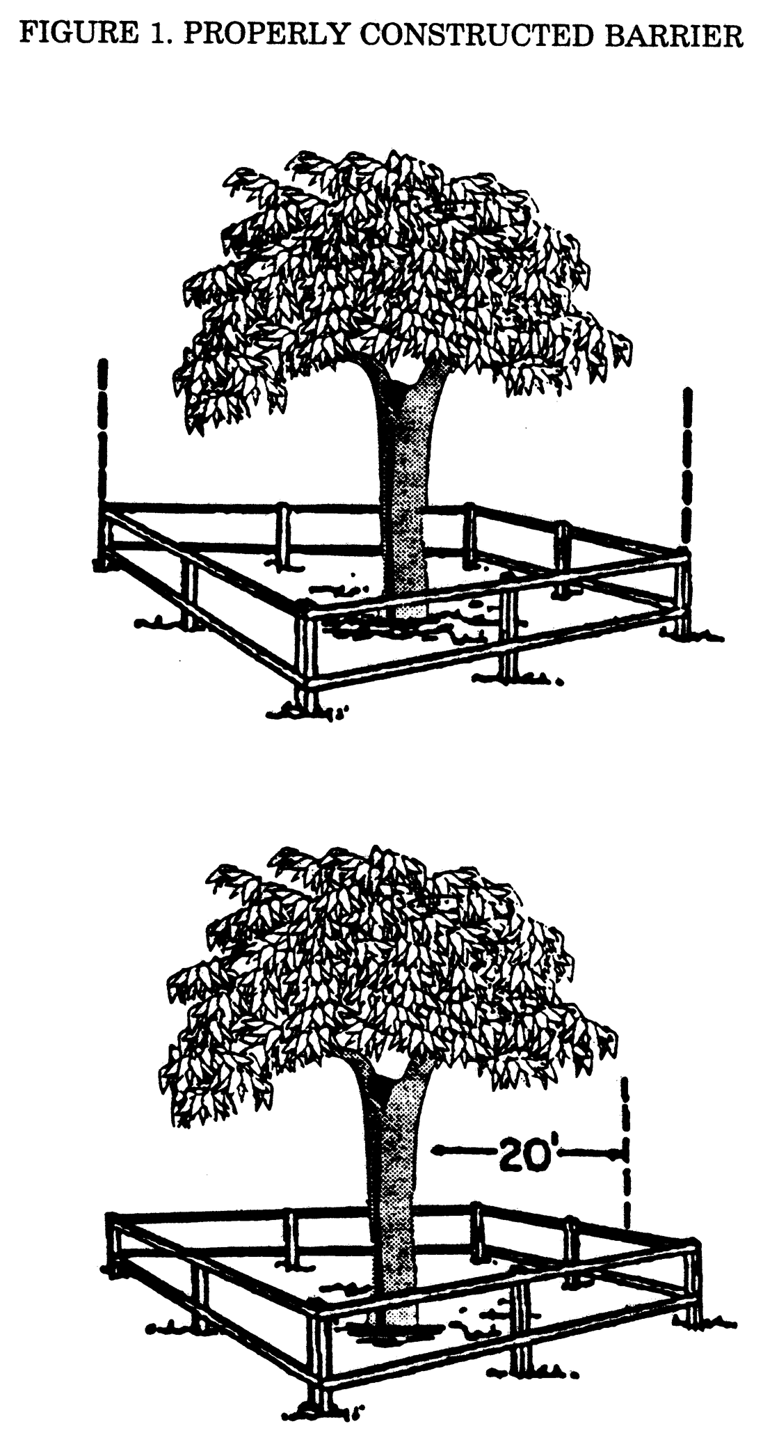 Prior to any land preparation or other development activities, a protective barrier easily visible to equipment operators shall be placed around all protected trees so as to encompass the entire tree protection zone. (See figure 1 following this section.)