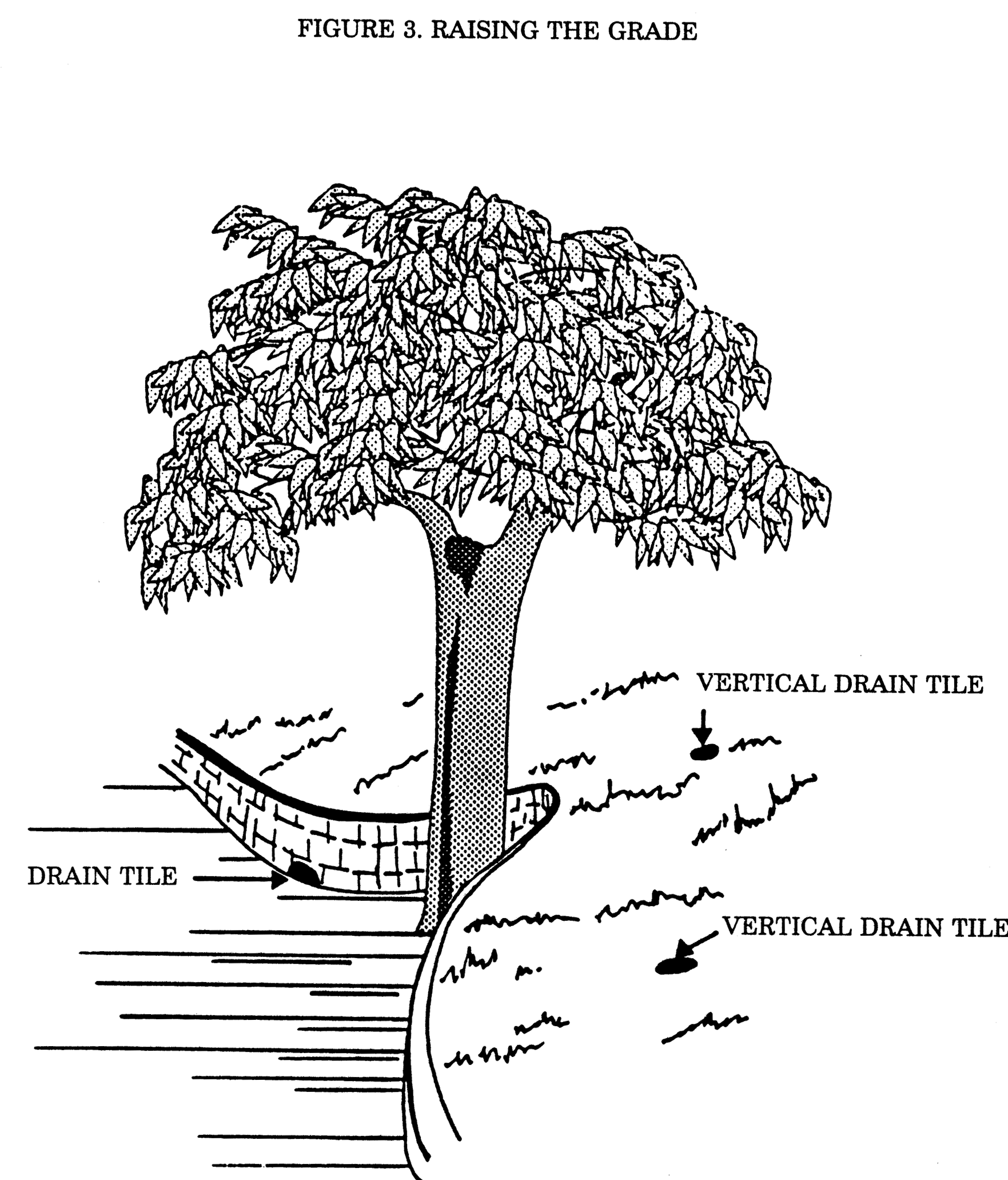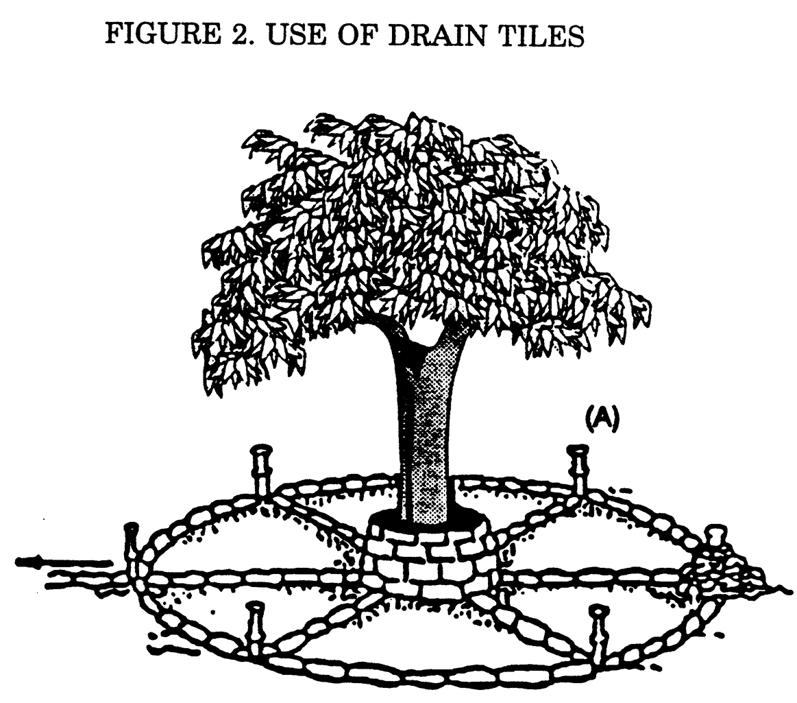 Porous four-inch agriculture drain tiles shall be laid over the soil to drain liquids away from the trunk. A drop of at least one-eighth inch per foot shall be provided. The drainfield shall be designed to provide adequate drainage of the existing configuration of the trees.