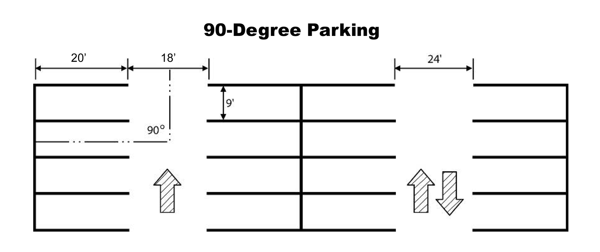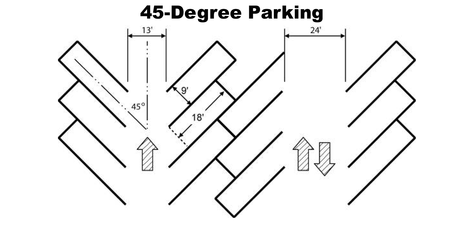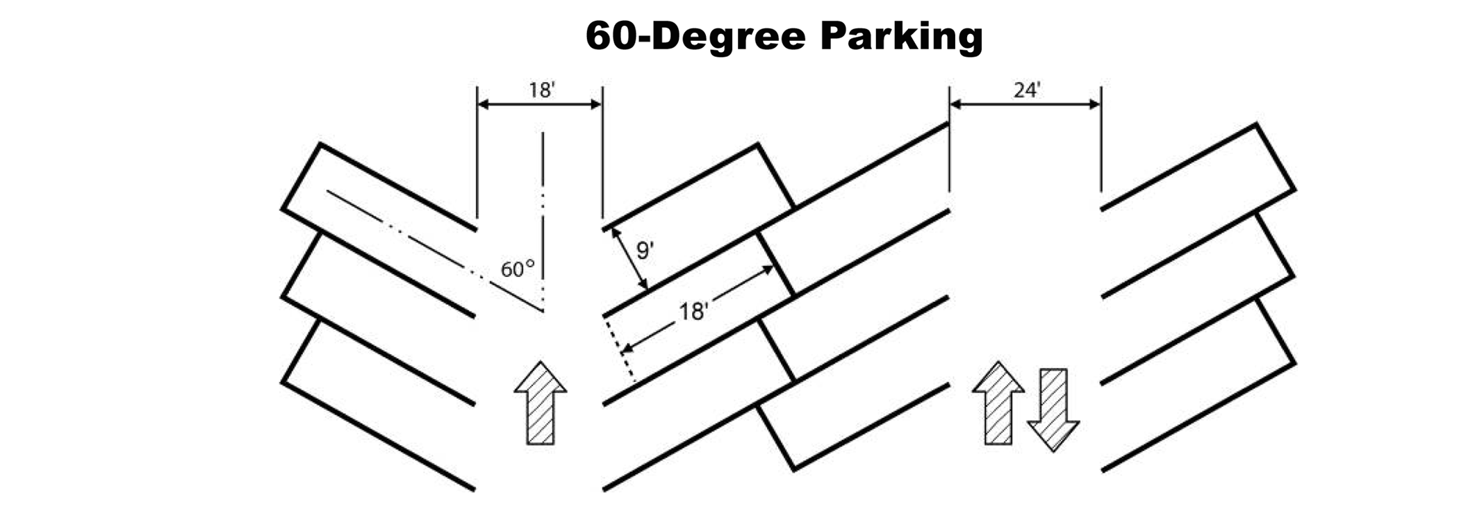 Parking spaces abutting an adjoining property line or street right-of-way shall be provided with wheel guards or bumper guards located so that no part of a normally parked vehicle will extend beyond the property line. When wheel guards are used, they must be centered 2½ feet from the property line for 90-degree parking; 2.3 feet for 60-degree parking, and two feet for 45-degree and 30-degree parking.