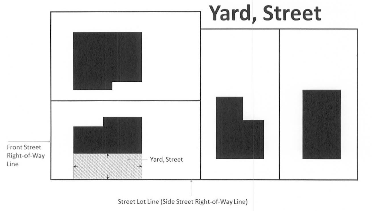 Yard, street: A yard extending along the side lot line between the front and rear yards, abutting a street right-of-way having a width as specified in the yard regulations for the district in which such lot is located. A street yard is an additional front yard for corner lots.