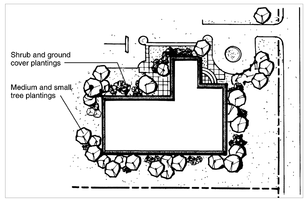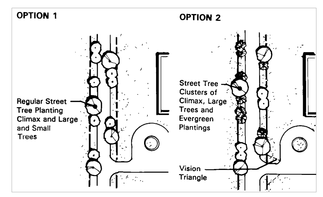 The exact placement of required plants and structures shall be depicted on the required detailed landscaping plan shall be the decision of each property owner within the requirements of this section, except that the following requirements shall be met: