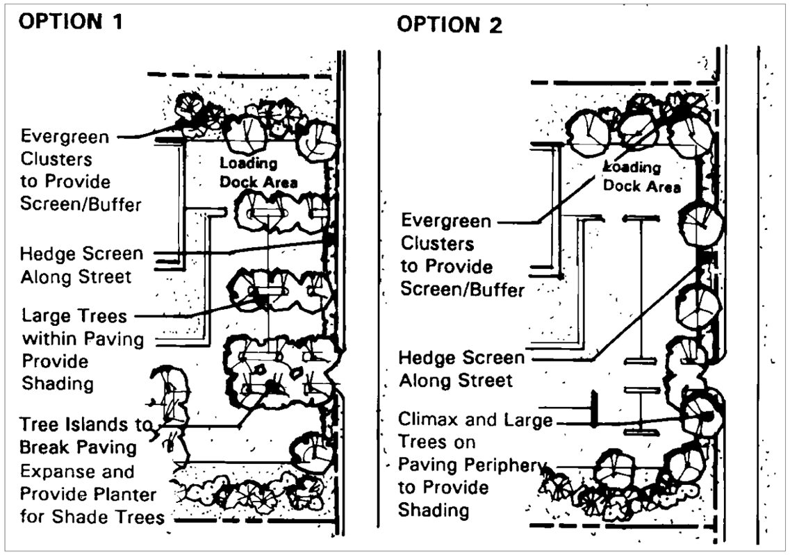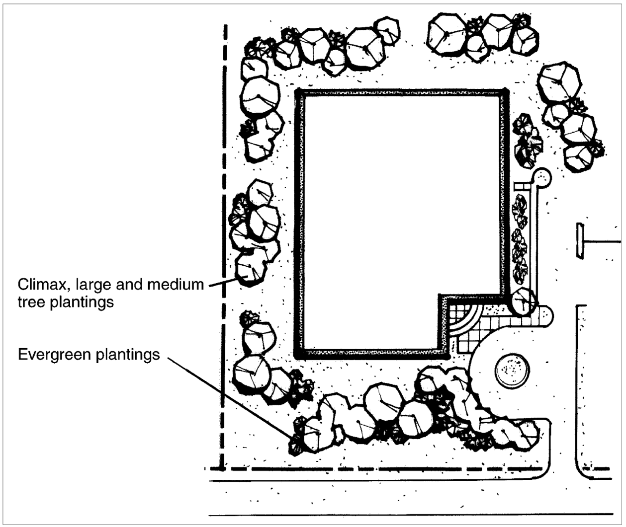 Climax trees and tall trees shall not be used to meet this requirement. The intent of this section is to require a visual break in the mass of buildings and to require a visual screen of a minimum of six feet in height for all exterior perimeter appurtenances (such as HVAC/utility boxes, standpipes, stormwater discharge pipes and other pipes).