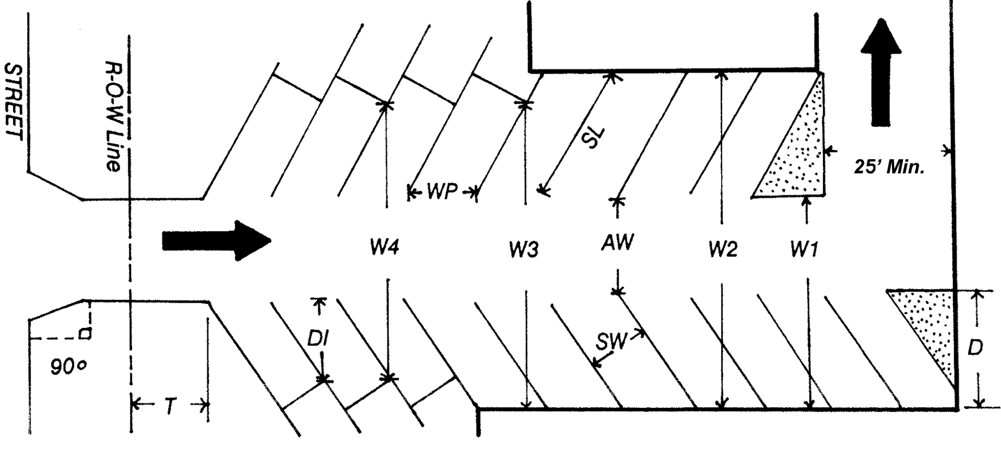 2 This dimension represents (AW) for one-way traffic. For two-way traffic, widen to a minimum (AW) of 26.0 feet.