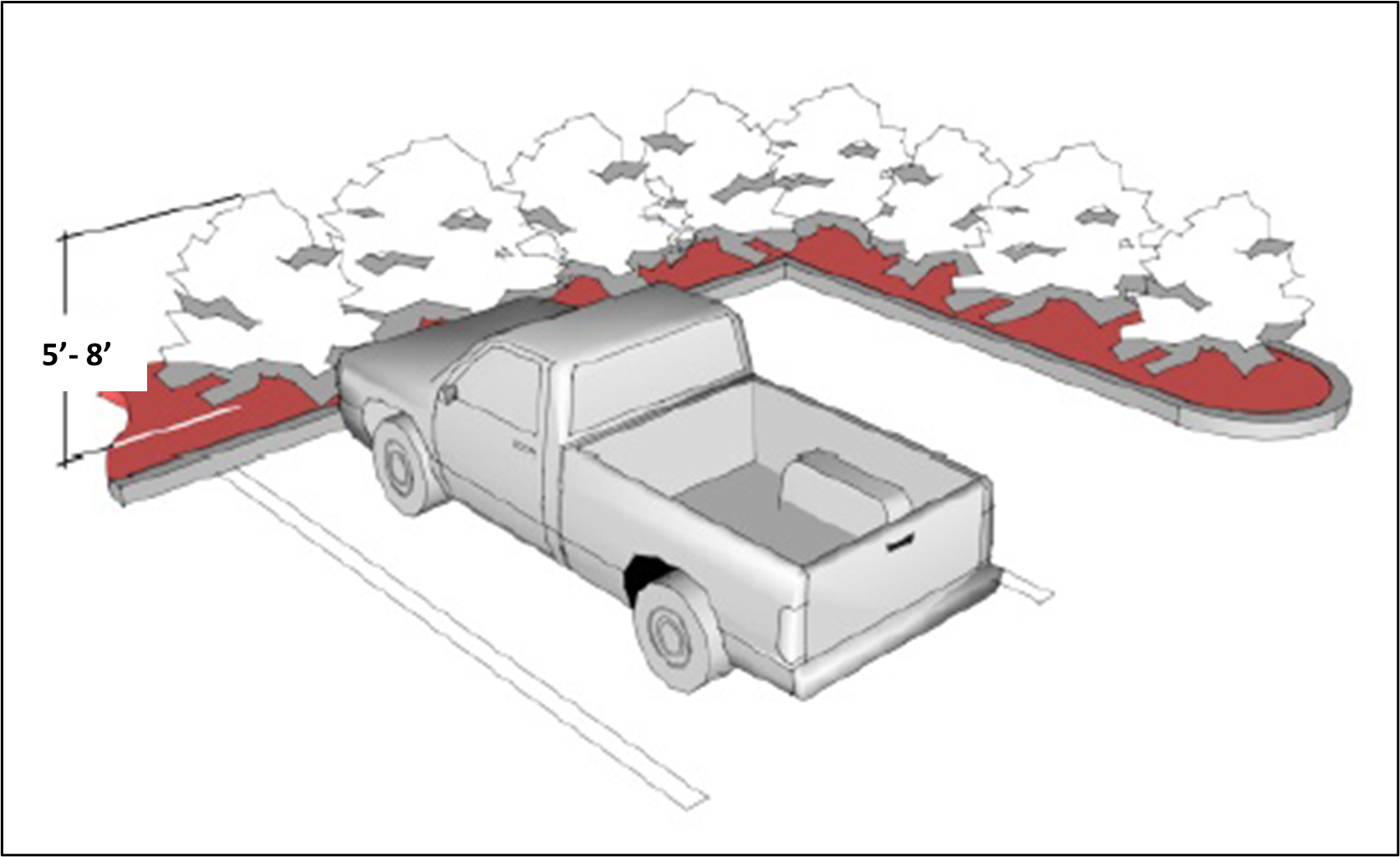Where any business or industrial use (i.e. structure, parking or storage) is adjacent to or within 100 feet of property zoned for residential use, that business or industry shall provide screening along the boundary of the residential property. Screening shall also be provided where a business or industry is across the street from a residential zone, but not on that side of business or industry that is considered to be the front. The screening required shall consist of a wall, fence or densely planted compact evergreen hedge not less than five feet or more than eight feet in height that blocks direct vision but shall not extend to within 15 feet of any street right-of-way. Landscaping shall be required between the screening and pavement. All required screening shall be installed by the owner of property which creates the need for said screening. Compact evergreen hedges may initially be planted according to the landscaping requirements as a potted or ball and burlap plant measuring a minimum of no less than three feet in height. While many evergreens are slow growing, others can grow quite quickly once established. Most evergreens, such as pine or spruce trees, and other coniferous landscape approved species are allowed to grow naturally to required minimum heights. Such plantings to meet this definition shall ensure there is enough room on all sides for such trees to spread out and achieve their normal expected maturity height and width. An approved planting plan shall also be defined so as to ensure there is adequate room for roots to spread out. If tree roots are confined to a small area because of buildings, walks, driveways, roads, alleys, adjoining site improvements, etc. (roots will not grow under hard surfaces), the root system will eventually be too small to provide for the size of the tree or hedge. If the trees or hedge then stops growing, declines, or eventually dies, or leaves gaps in the approved screening barrier, then the definition of a compact evergreen tree or hedge for required screening under this development code shall no longer exist and may be subject to compliance or enforcement actions as defined under this development code. For foundation plantings or shrub beds, many dwarf evergreens species shall be defined as meeting this definition. Such species shall include, but not be limited to various common names such as, arborvitae, Japanese yew, hemlock, junipers, etc.