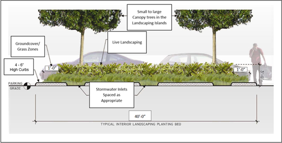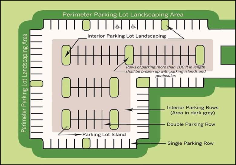 A minimum of at least eight percent of the merchandise display and parking lot area shall have live landscaping, including trees, within the interior of such areas, including circulation areas.