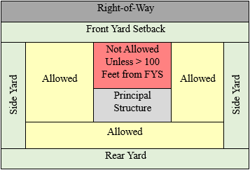 All detached accessory buildings or structures shall be located in the side or rear yards and shall not be placed directly between the front yard setback and principle structure. If the principle structure is set more than 100 feet from the front yard setback, then the accessory building may be placed directly between the front yard setback and principle structure. All such structures shall comply with all yard setback requirements applicable to the structures located within the zoning district.