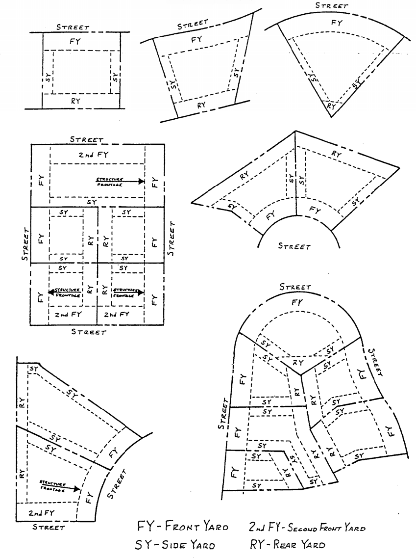 "Yard, front" means a yard extending between side lot lines across the front of a lot adjoining a public street. (See Figure 17.08-3) In the case of through lots, unless the prevailing front yard pattern on adjoining lots indicates otherwise, front yards shall be provided on all frontages. Where one of the front yards that would normally be required on a through lot is not in keeping with the prevailing yard pattern, the planning director may waive the requirement for the normal front yard and substitute a special yard requirement which shall not exceed the average of the yards provided on adjacent lots.