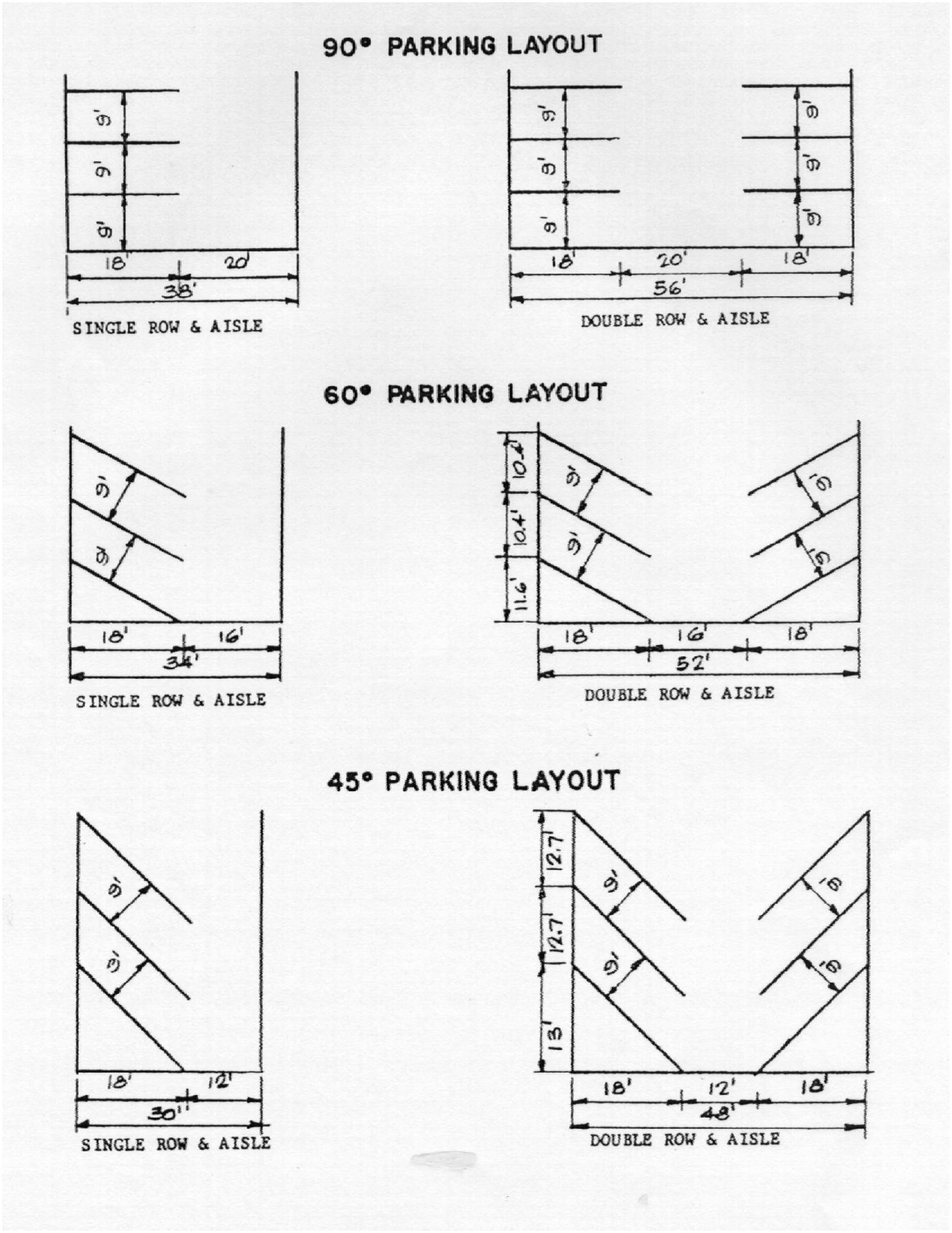 For a single row of ninety degree head-in parking, the minimum width for a parking space plus aisle shall be thirty-eight feet. For two rows of ninety degree head-in parking using the same aisle, the minimum width for parking spaces plus aisle shall be fifty-six feet. (See Figure 17.88.020-1)