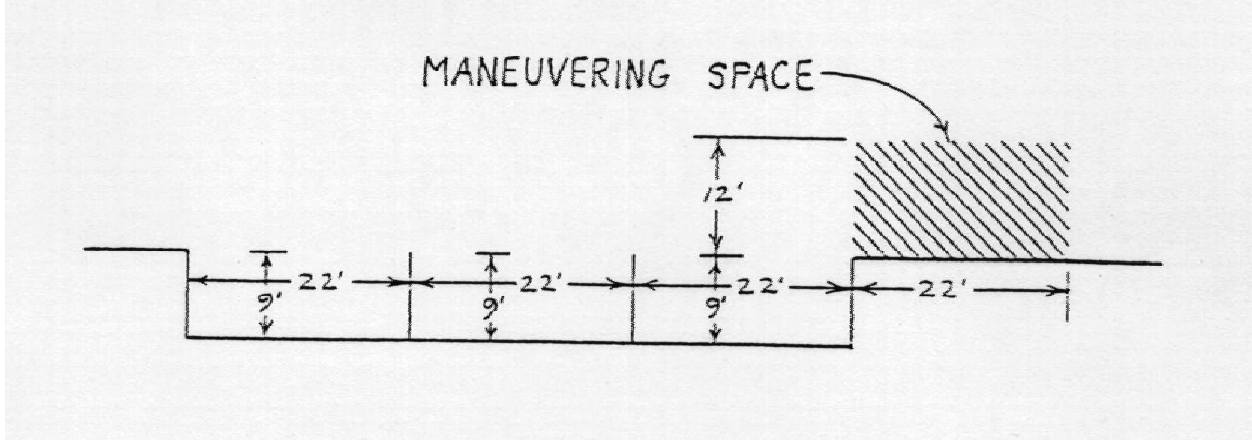 A single line of parking spaces may be provided parallel to an aisle provided they are at least twenty-two feet in length and nine feet in width and twenty-two feet of maneuvering space in front of and diagonal to the front most parallel parking space. (See Figure 17.88.020-2)