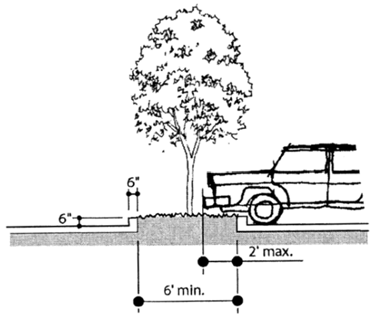 Diamond-shaped planters shall be a minimum of six feet in width with a six inch height and six inch width curb. A two feet clearance between the inside of the curb and the circumference trunk of the tree is required to avoid damage to the tree trunks. See Figure 17.98.050 - B.