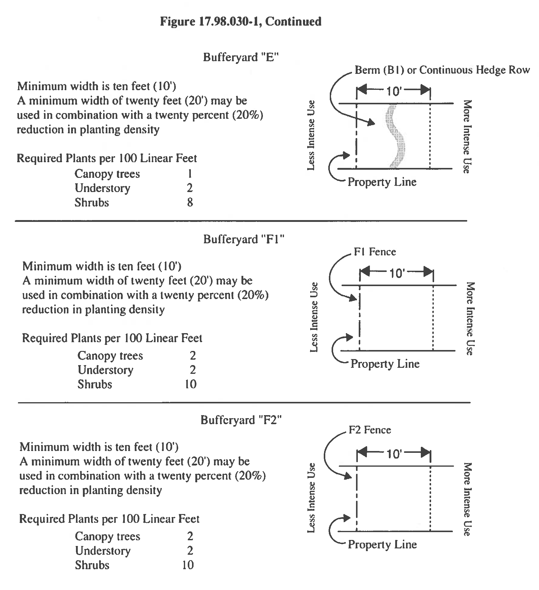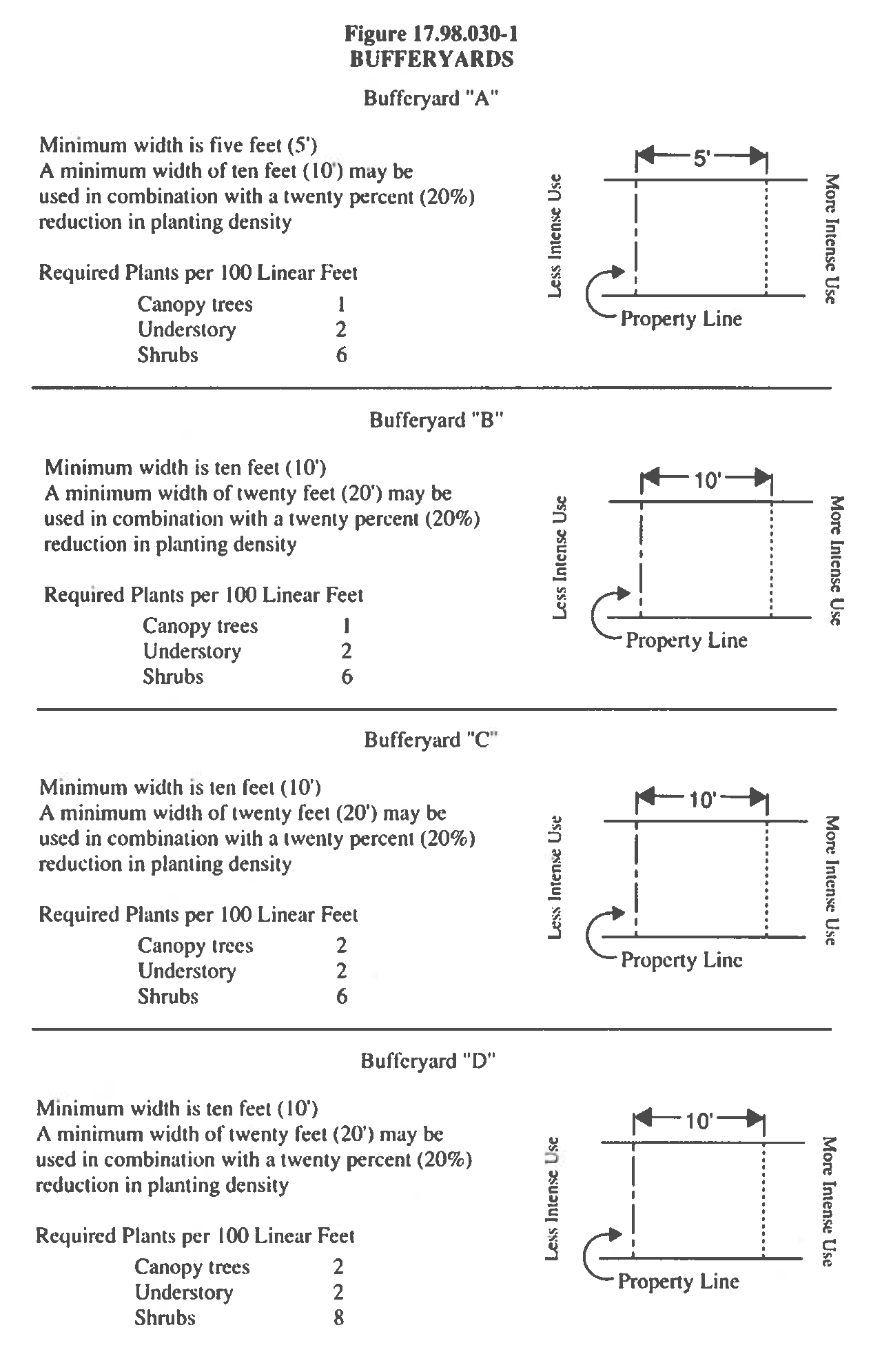 Tables 17.98.030 - A and 17.98.030 - B determine the type of bufferyard required between two adjacent parcels or a parcel and a roadway. The letter designations contained in the tables refer to the different bufferyards described in Figure 17.98.030-1, Illustration of Bufferyards, in this Chapter. The following is a summary of the bufferyards: