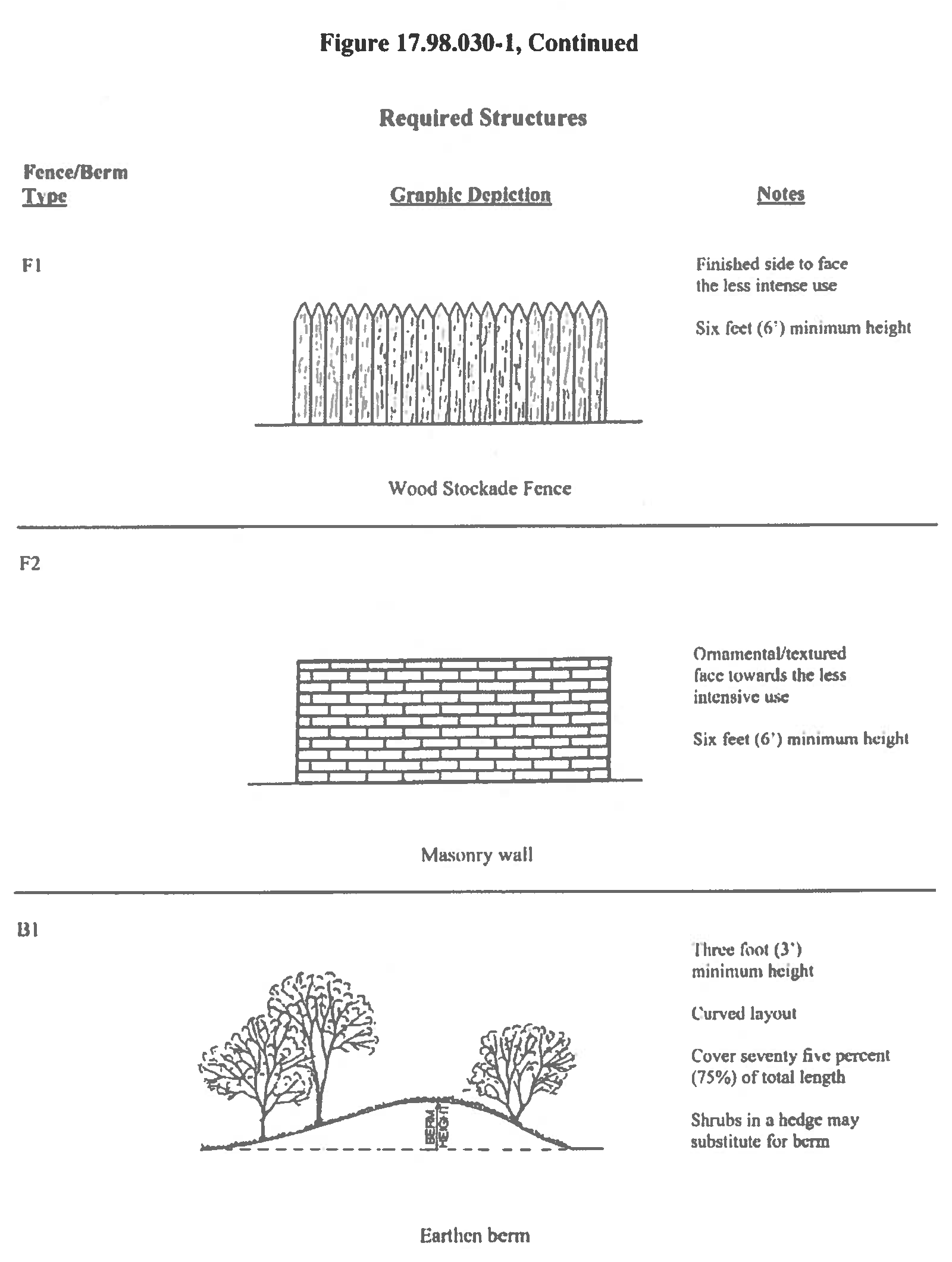 Walls and Fences: Whenever a wall and/or fence is required within a bufferyard, it shall be six feet in height and constructed in accordance with specifications set forth in the City's Design Standards and Criteria. A "F1" fence may be wood stockade; a "F2" wall and/or fence shall be of masonry construction. A "finished" side of a wall or fence shall face the residential or less intense land use side.