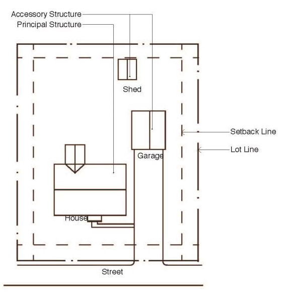 Accessory building or structure means a building or structure detached from a principal building and customarily used with, and clearly incidental and subordinate to, the principal building or use, and located on the same lot with such principal building. See Figure 2-1.