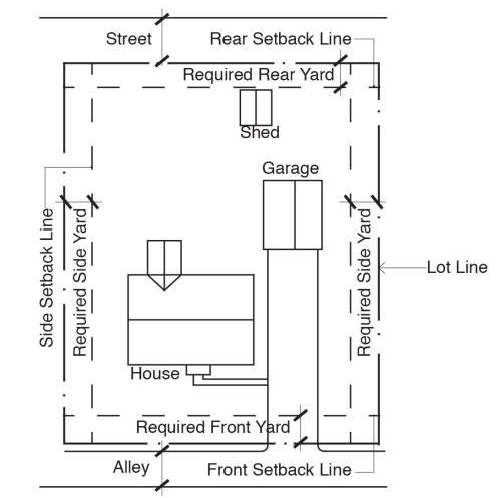 Setback line means the line that is the required minimum distance from any lot line and that establishes the area within which the principal structure must be erected or placed. See Figure 2-4.