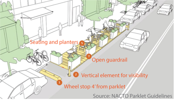 d. Separation from street infrastructure. Parklets shall not block critical curbside or street infrastructure. These include, but are not limited to: fire apparatus, utility meters or manholes, and handicap-accessible parking spaces.