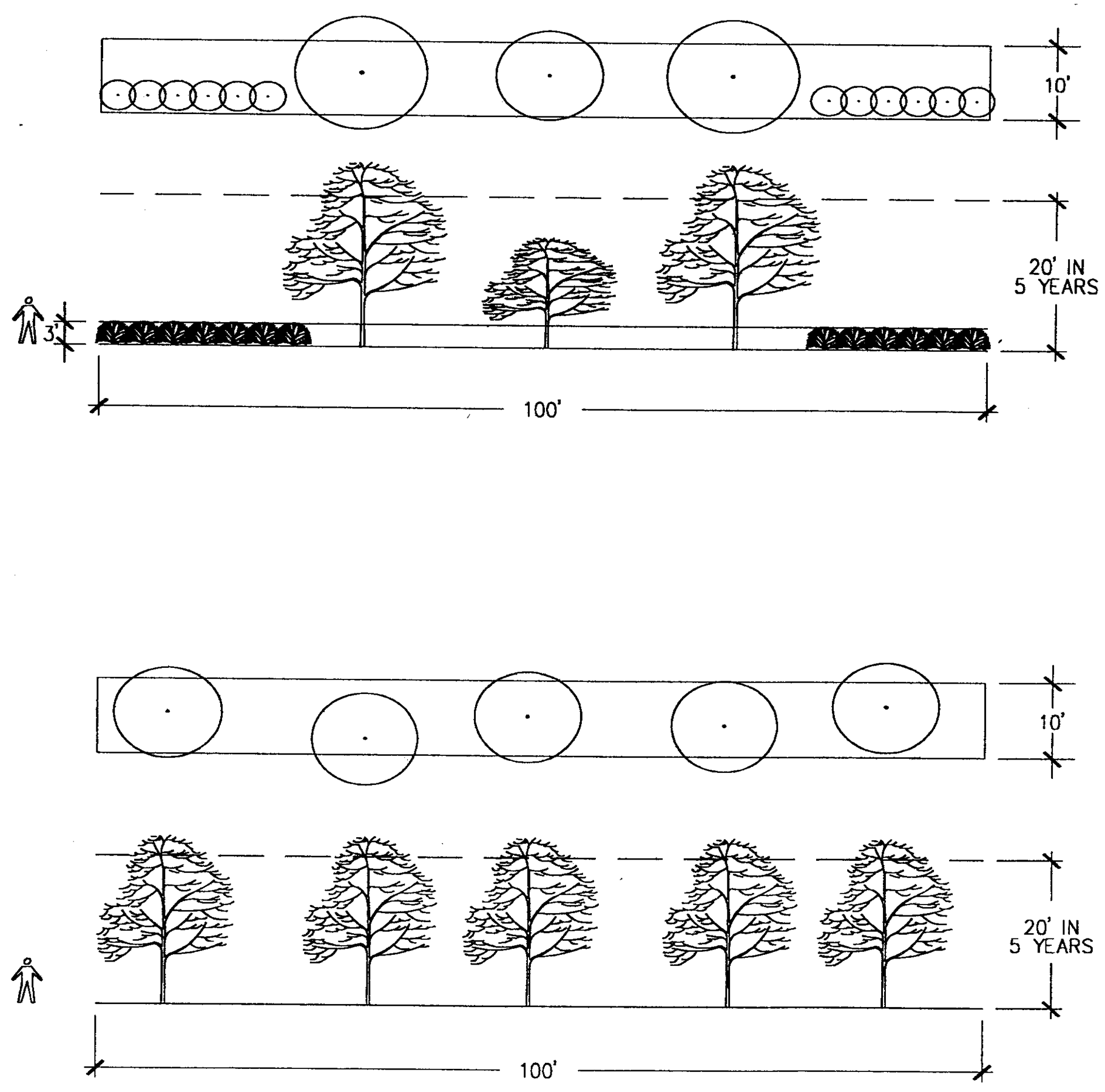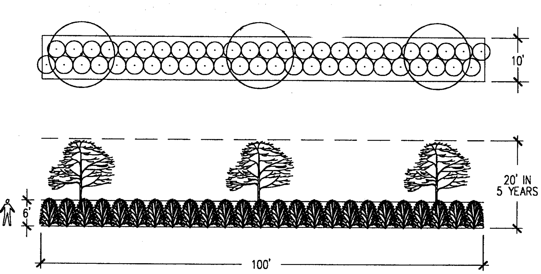 Broken screen, type C. A screen composed of intermittent visual obstructions composed of trees or trees and shrubs, with the trees, with the trees growing to a height of at least twenty (20) feet, as described below. The broken screen is intended to create the impression of a separation of spaces without necessarily eliminating visual contact between the spaces. For every linear one hundred (100) feet, or fraction thereof, the screen may consist of either: (a) a combination of at least two (2) canopy or ornamental type trees, each having a minimum caliper of at least two (2) inches and that in five (5) years shall reach a height of at least twenty (20) feet, and shrubbery at least three (3) feet in height that covers an average of at least 20 percent (20%) of the screen area; or (b) at least five (5) canopy or ornamental type trees, each having a minimum caliper of two (2) inches and that in five (5) years shall reach a height of at least twenty (20) feet. A graphic illustration of a sample planting pattern is included in Graphic 4.1 [following this section].
