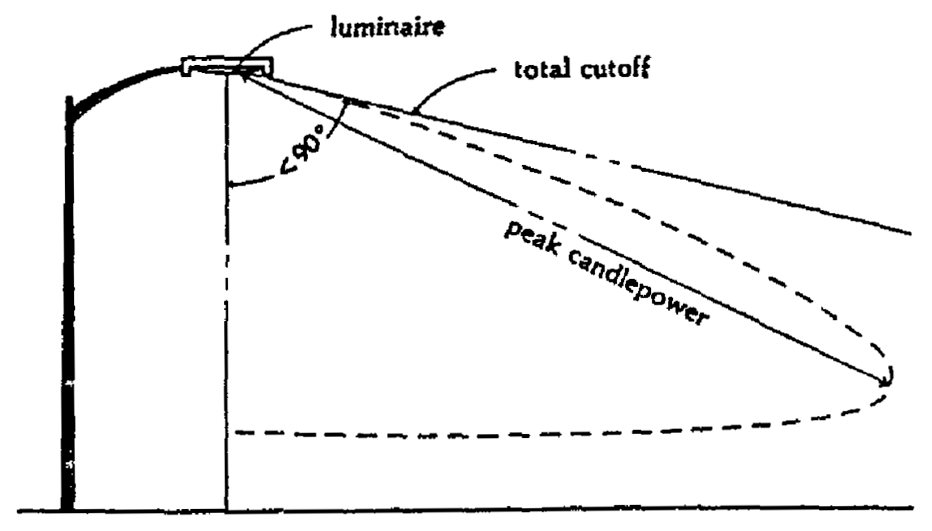 All luminares (light sources) must have a cutoff angle of less than ninety (90) degrees. Exterior lights must be placed so that the bulb or light source is not visible off-site, light is directed down, and the light level at the property line does not exceed 0.25 footcandles.