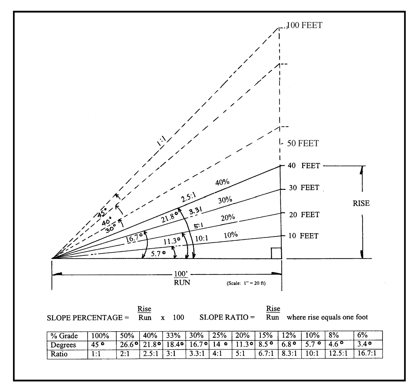 "Slope" shall mean an inclined ground surface, the inclination of which is expressed as a ratio of horizontal distance to vertical distance. See "Gradient."