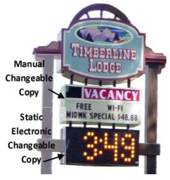 "Changeable copy sign." A fixed sign face or surface on which message copy can be changed. Changeable copy signs including the following types: