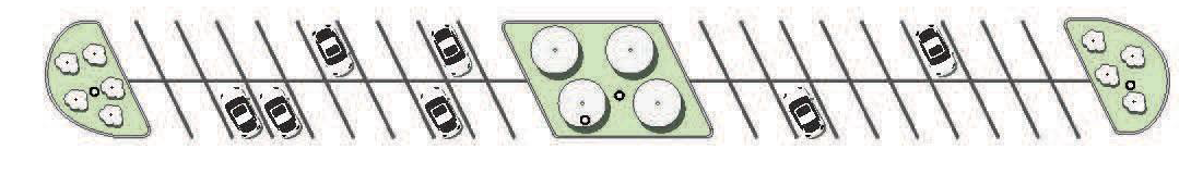 Increasing parking lot traffic safety by guiding the circulation of cars and people and lowering traffic speeds;