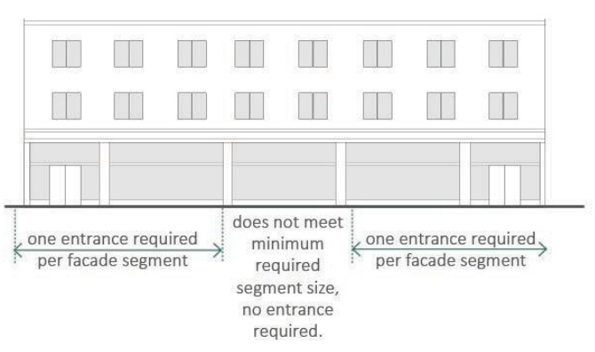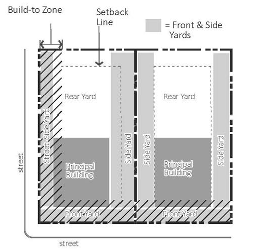 Build-to zones. The build-to zone, when required, is designated separately for each street frontage, front and street-side, in the site and structure regulations table for each district. Façade elements such as front door(s), windows on the ground floor and a percentage of the front façade must be within the build-to zone as shown in the site and structure regulations table for each district. Front or side street facades setback equal to or more than twice the maximum build-to zone in the district are not considered part of the front or street side façade.