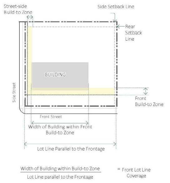 Measurement. The width of the principal building, as measured within the build-to zone along the front lot line, is divided by the length of the frontage parallel to the front lot. Side yard and street-side yards are not included in the build-to zone area. Refer to Figure 27-1800-4. Minimum Front Lot Line Coverage.