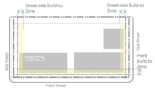 Build to corner. Buildings are required to be located within the intersection of the front and street-side build-to zones at street corners.