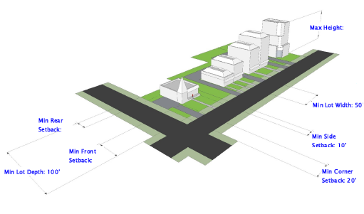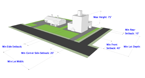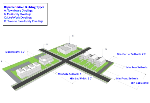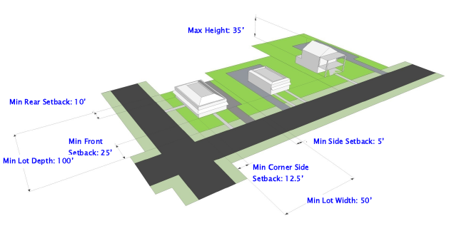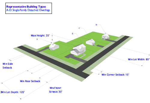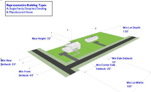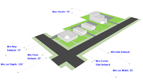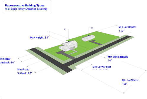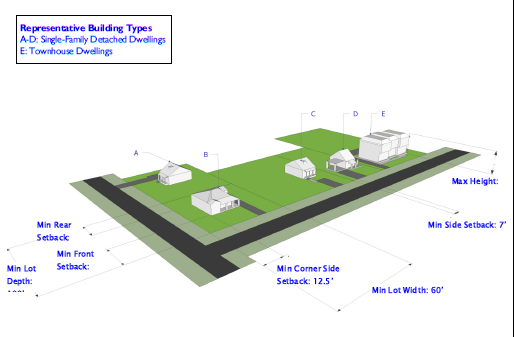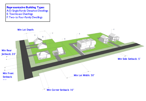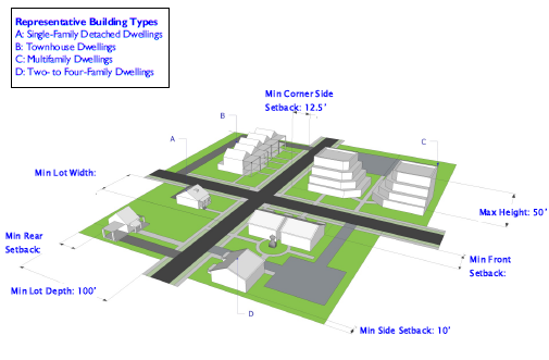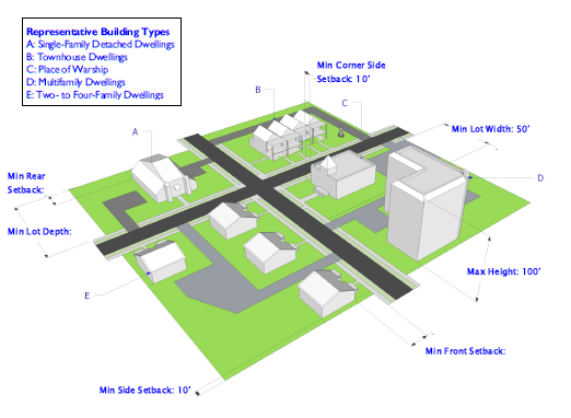 Sections 23-3-2 through 23-3-5 have a common structure for describing each base district, consisting of a statement of the purpose of the district, table(s) summarizing the basic intensity and dimensional standards established in Article 5: Intensity and Dimensional Standards, that define the district's character, photograph(s) of building forms typical in the district, and a graphic depiction of how the district's intensity and dimensional standards apply to typical lot patterns and building forms.