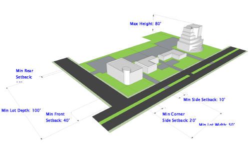 The nonresidential base zoning districts are established for the general purpose of ensuring there are lands in the city that provide a wide range of office, retail, service, institutional, industrial, and related uses to meet household and business needs, and more specifically to: