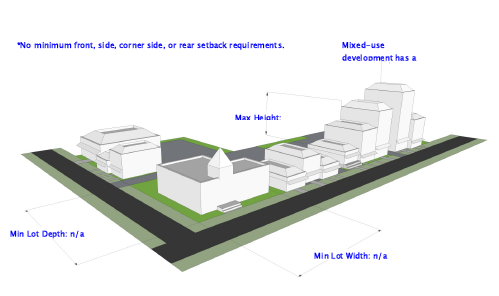 The tables and graphics are intended to illustrate the general character of the district, and do not necessarily reflect all the standards that may apply to a particular development. All development is subject to Article 23-4: Use Standards, Article 23-5: Intensity and Dimensional Standards, and Article 23-6, Development Standards. If an intensity or dimensional standard summarized or graphically depicted in this article for a base zoning district is inconsistent with an intensity or dimensional standard established in Article 5: Intensity and Dimensional Standards, the standard established in Article 5 shall govern.
