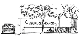Within the sight triangles, no fence, wall, sign, earthworks, hedge, shrub, or other structure or planting shall be located, maintained, or permitted to grow between the heights of three and seven feet above the grade elevation of the adjacent road. Public safety and utility devices (such as street light, street sign, and telephone poles) and trees less than 12 inches in diameter are exempt from these standards, provided their number and location is limited, and the limbs and foliage of any such trees are trimmed, so as to ensure provision of the required unobstructed cross-visibility. (See Figure 23-7-4(I)(2), Sight Triangle Clear Visibility.)