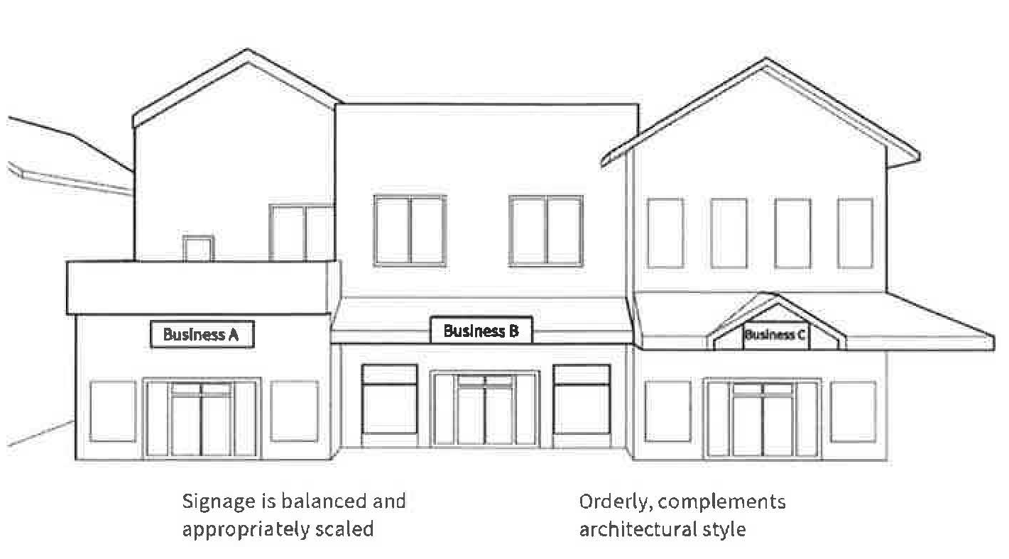 Compatibility with other signs. Signs including its supporting structure and components should be integrated with the design of other signs located on or near the same building to complement or enhance the other signs. The design and alignment of signs on multi-use buildings should be complementary, but not uniform or duplicative.